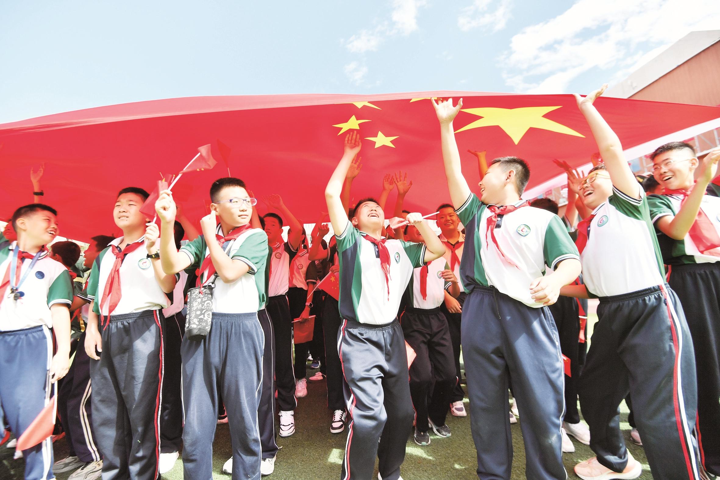 9月2日上午,昆区钢铁大街第四小学举行了“同心共筑强国梦 踔厉奋发向未来”原天安门国旗班进校园主题升旗仪式。迎着东方的晨曦,全校师生怀着满腔热爱,共护国旗,感受着一场震撼心灵的教育盛宴。 记者 吴杰 摄