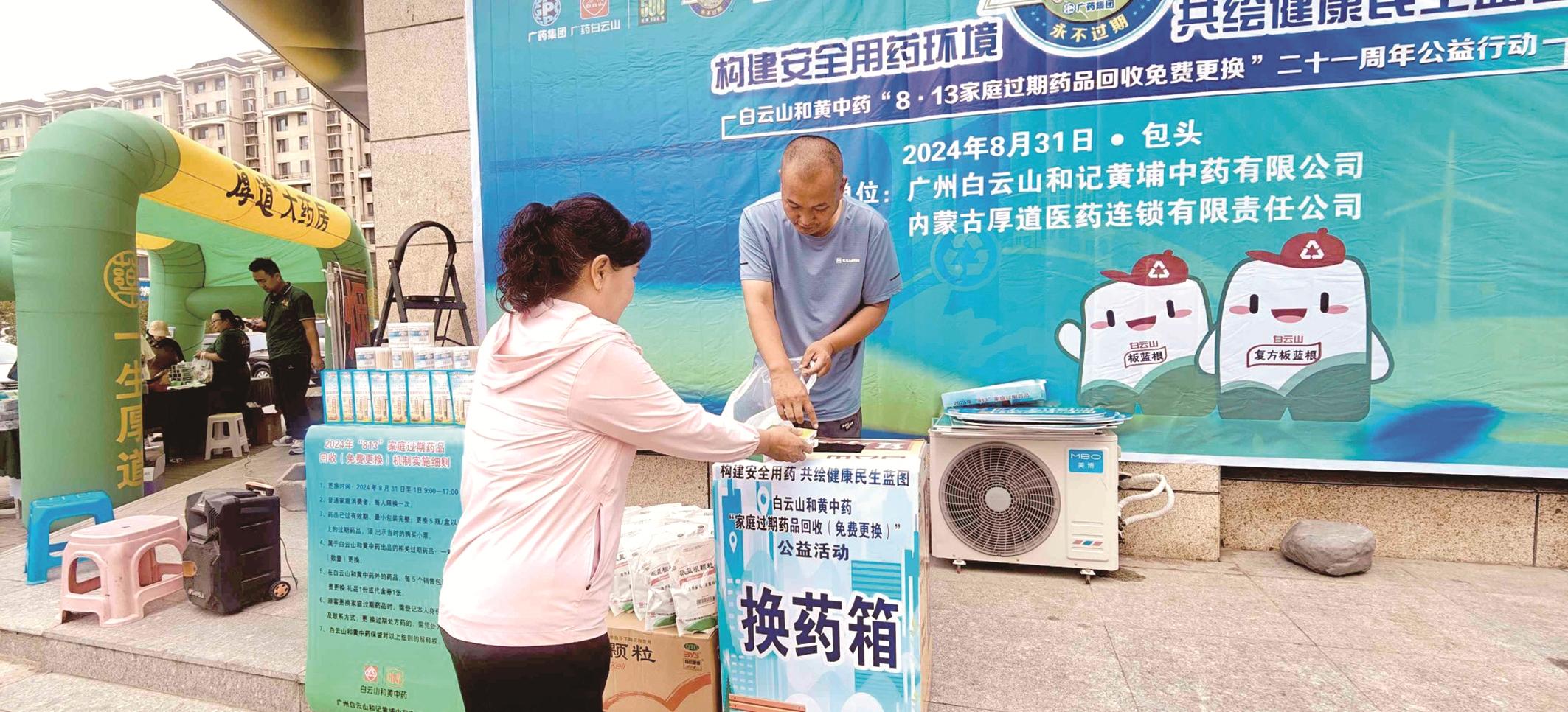 本次家庭过期药品回收(免费更换)活动以“构建安全用药环境,共绘健康民生蓝图”为主题,开展了2024年家庭过期药换购惠民活动、征集“永不过期”志愿者,为优秀“永不过期”药店授牌,发放爱心大礼包等系列活动。期间,市民可携带家庭过期药品前往内蒙古厚道医药连锁有限责任公司北梁新区北三区门店等回收网点登记回收,购买白云山和黄埔中药相关产品,可享受代金券优惠活动,并享受白云山和黄中药提供的免费更换服务。