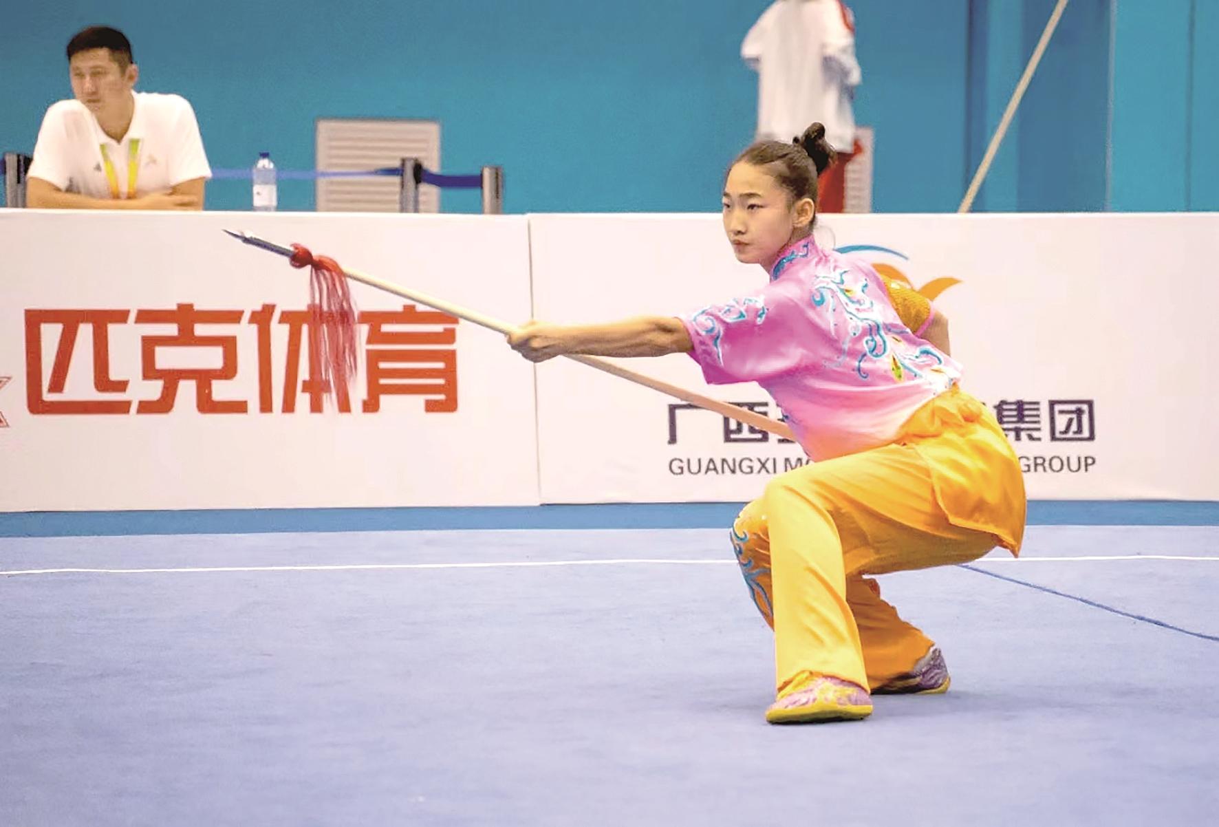面对这样的成绩,李彬不骄不躁,持续深耕。2023年7月,参加自治区第十五届运动会,荣获女子长拳、剑术全能第一名和优秀运动员称号;10月,参加自治区中学生武术锦标赛,荣获女子短器械第一名和集体项目第一名;11月,在广西参加中华人民共和国第一届学生(青年)运动会,与全国青少年同台竞技,最终获得女子剑术第六名、枪术第五名、对练第三名的好成绩;12月,前往贵州参加全国武术竞赛,荣获女子枪术第七名。从开始训练至今,累计获奖三十六次。荣誉只代表过去,她依旧保持着谦逊的态度,沉稳地踏上新的征程,用不懈的努力去创造更多辉煌。