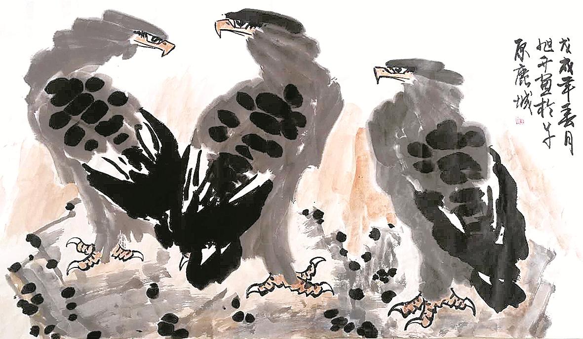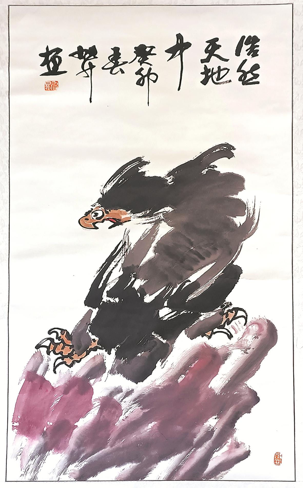 一阵尖锐的啸声划破长空,一个矫健的鸟影渐渐清晰起来:弯曲的喙、犀利的眼神、丰满的羽毛,扇动着宽大的翅膀在天空翱翔,蓦地展开尾翼、一个翻身、俯冲,瞬间便降落在陡峭崖顶的松枝上。然后,这只鹰收束身形,端立树上,凝望远方……他迅疾地抓起一支提斗笔,笔尖蘸墨,几笔便勾勒出鹰的头部;笔身蘸水,侧锋行笔,画出鹰的肩膀、胸腹;再蘸墨,画出鹰的飞羽及尾翼;紧接着调整笔锋,勾出鹰的脚趾,挑出鹰的爪钩,一幅竖版松鹰图跃然纸上。他眯起眼睛,笑意写在了眉梢……