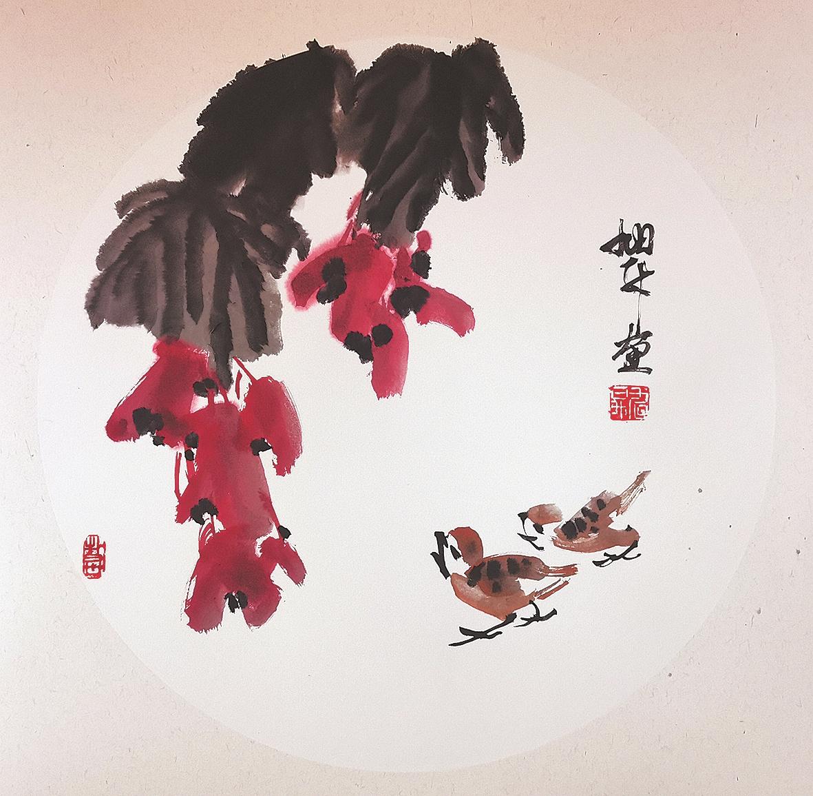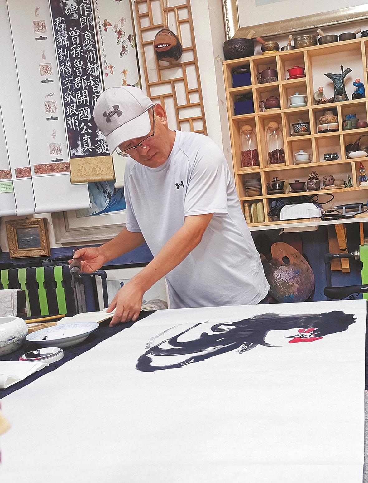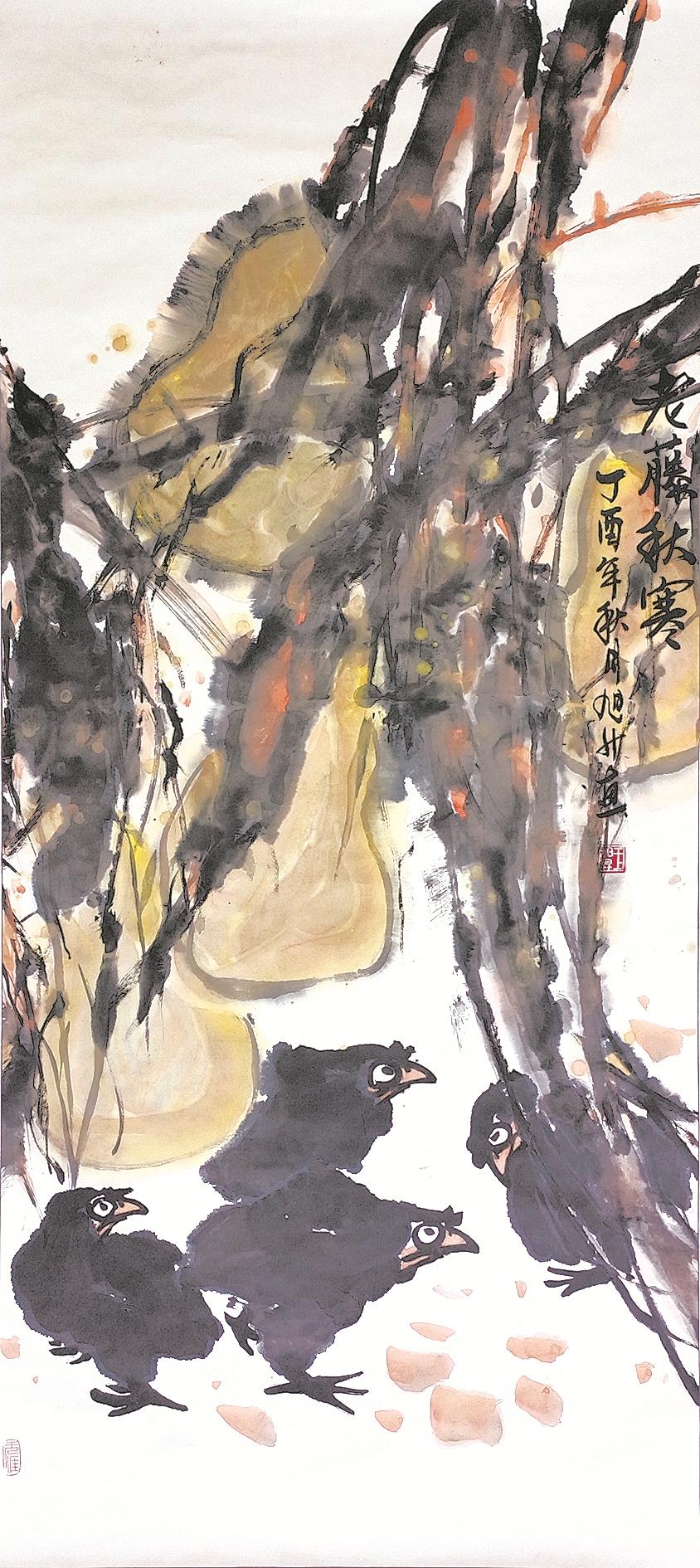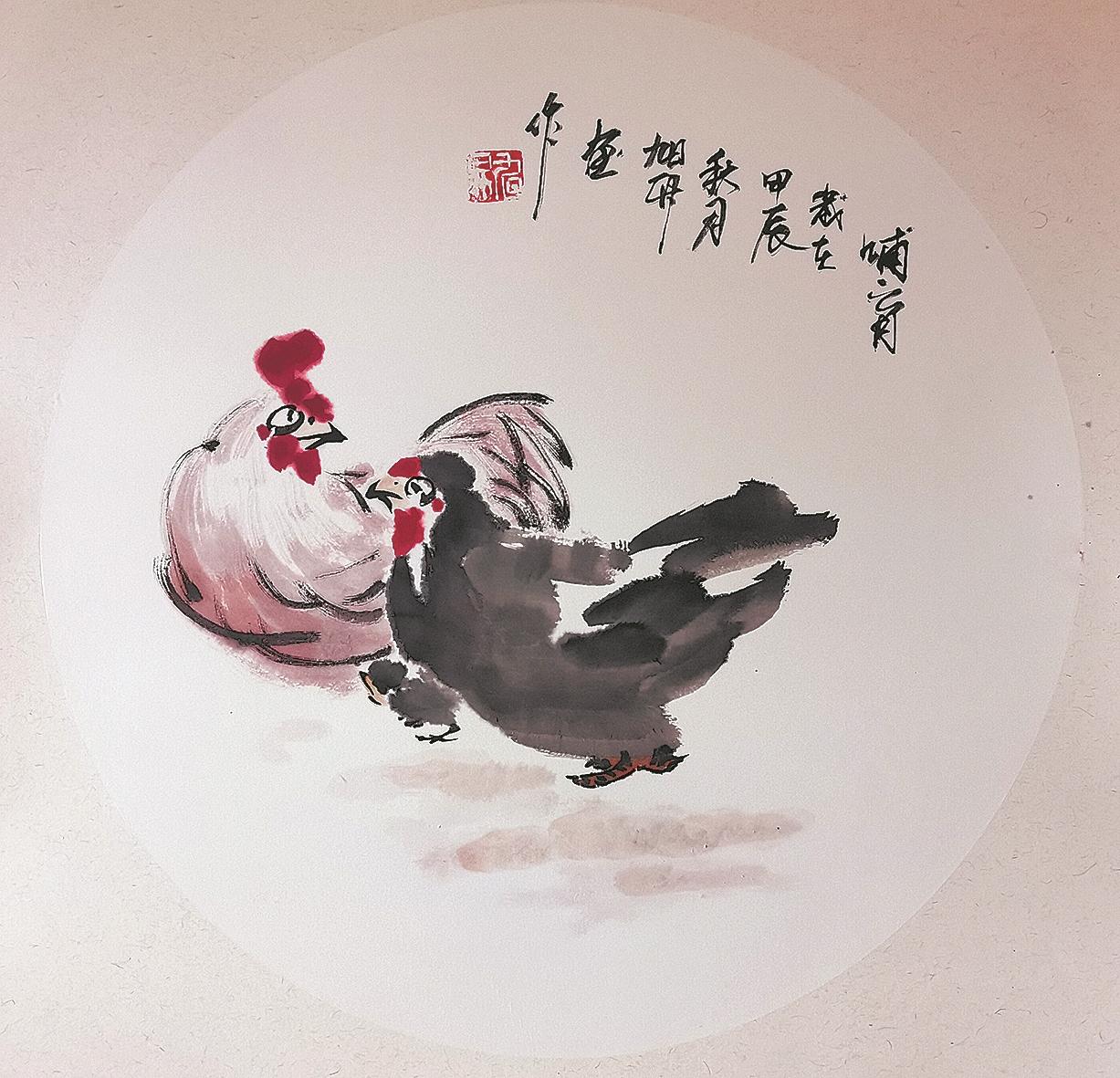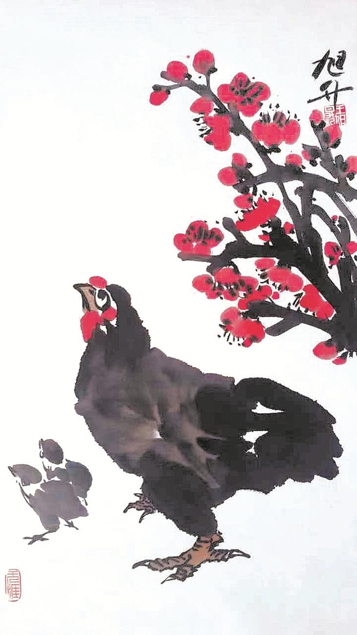王旭升在研究绘画的同时,也深入地学习书法,“我喜欢《爨宝子》魏碑、文徴明的行书、沈曾植的行书,国画大写意强调‘写’,是以书法笔意入画,所以书法是大写意的基础。”王旭升画的公鸡,最能体现他以书入画的观念,斗笔疾书,刷刷几笔,左右开弓,翅膀、翎毛一挥而就,再中锋行笔,勾出脚爪,最后朱砂抹出鸡冠,题款,齐活儿。整个过程一气呵成,行云流水,让人看了很是解压。