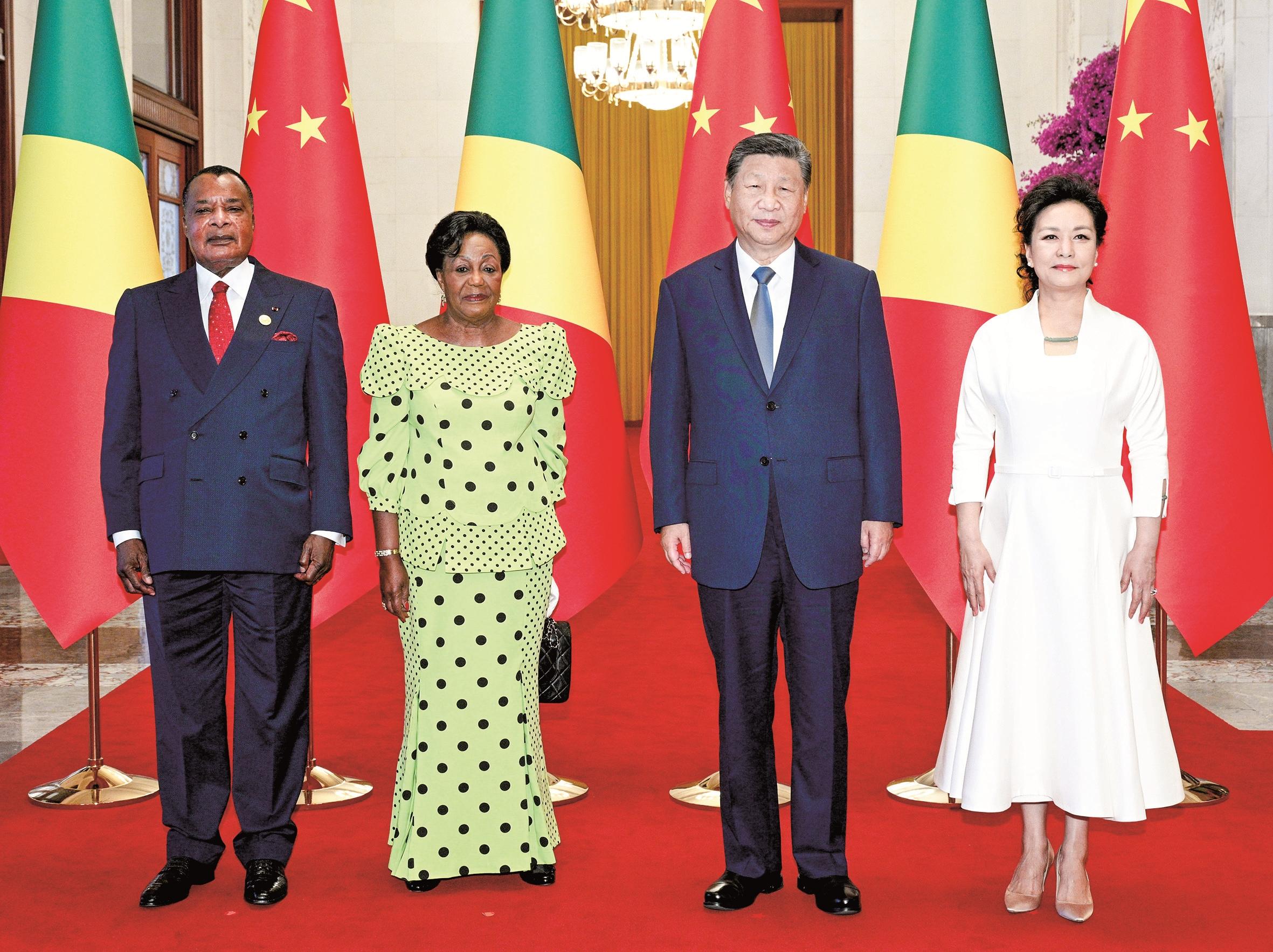 9月6日上午,国家主席习近平在北京人民大会堂同来华出席中非合作论坛北京峰会并进行国事访问的刚果(布)总统萨苏举行会谈。会谈前,习近平和夫人彭丽媛在人民大会堂北大厅为萨苏和夫人安托瓦内特举行欢迎仪式。这是习近平和彭丽媛同萨苏和安托瓦内特合影。新华社记者 李学仁 摄