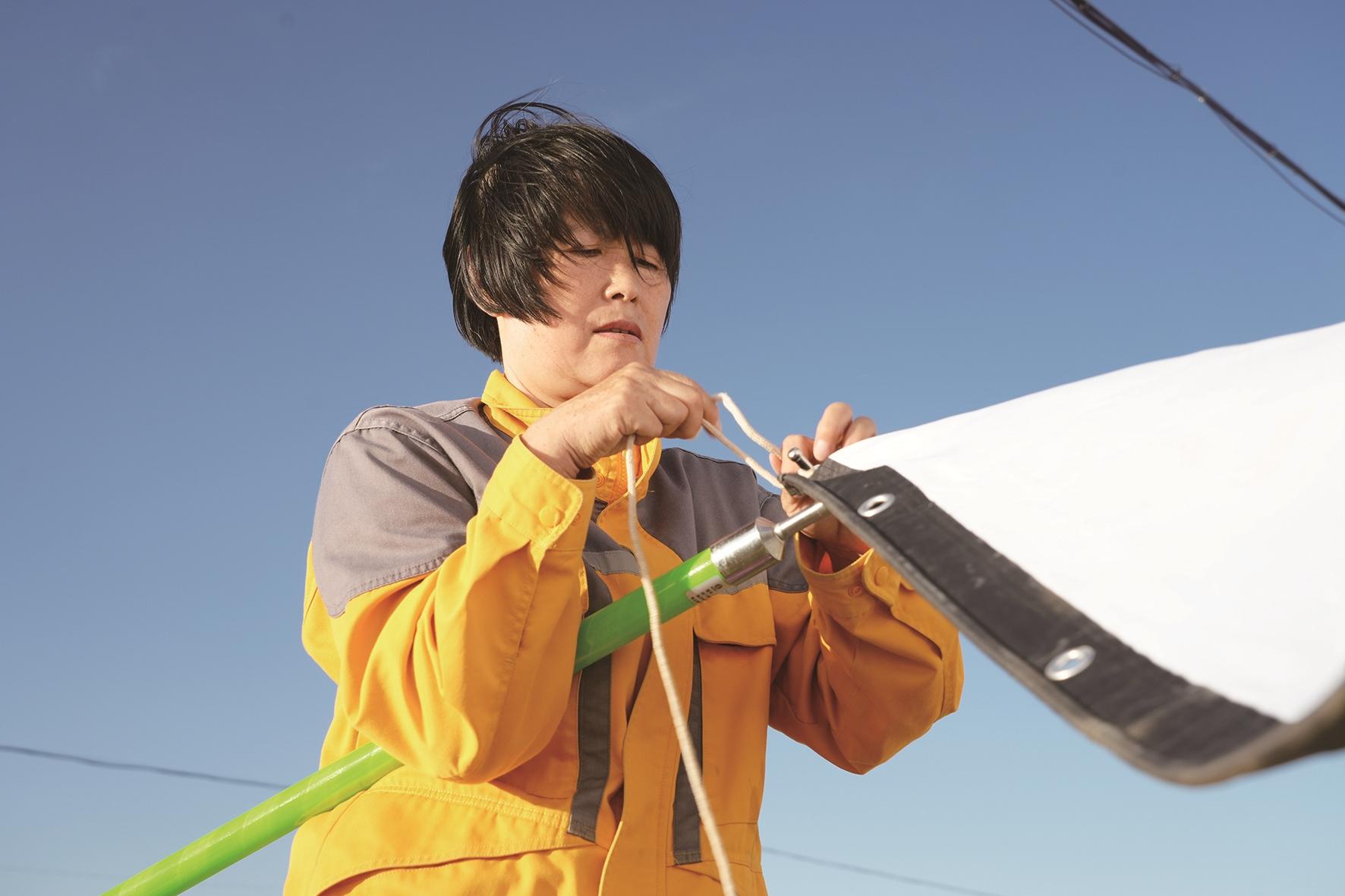 搭一个3米宽、5米长的投影布,是个技术活。迎着大风搭幕布对于一个女性来说难度不小。套上风绳立起支撑杆,大风吹过来,才撑起一半的影布就迎着风飘扬起来,变成一面招展的“大旗”,艰难撑着杆的孟英仿佛一个“擎旗女战士”。