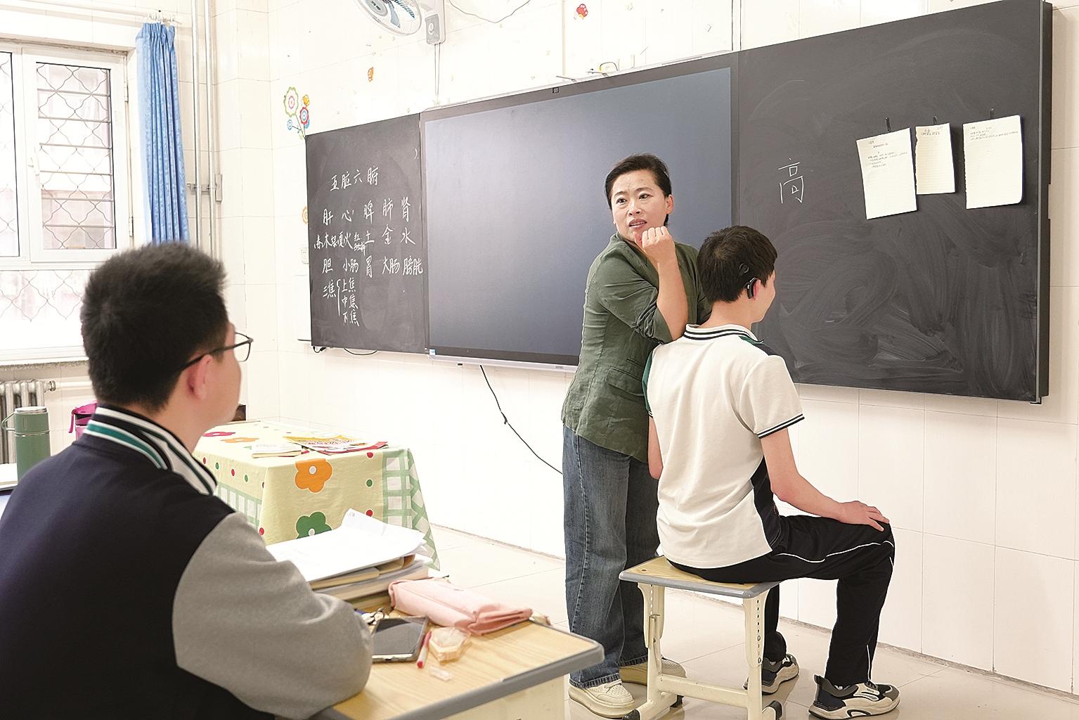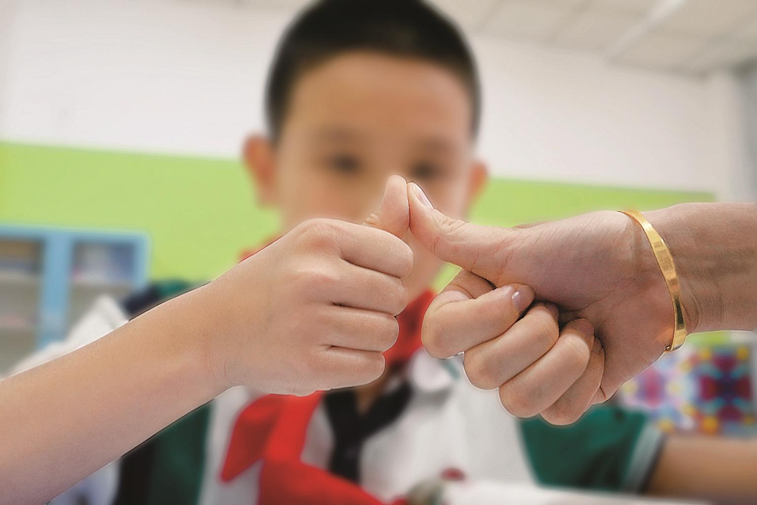 “棒!棒!”在三年级的教室中,语文老师翟宇红正在教一位听力障碍学生念“蝴蝶”一词,她让孩子一只手放在自己的嘴前,另一只手放到她的嘴前感受发音时喷在手心的气流。孩子目不转睛地盯着她的嘴,自己也学着发声。听到孩子小心翼翼发出的声音,翟宇红开心地一把抱住他,向他做出“棒”的手势,孩子也露出灿烂的笑容。