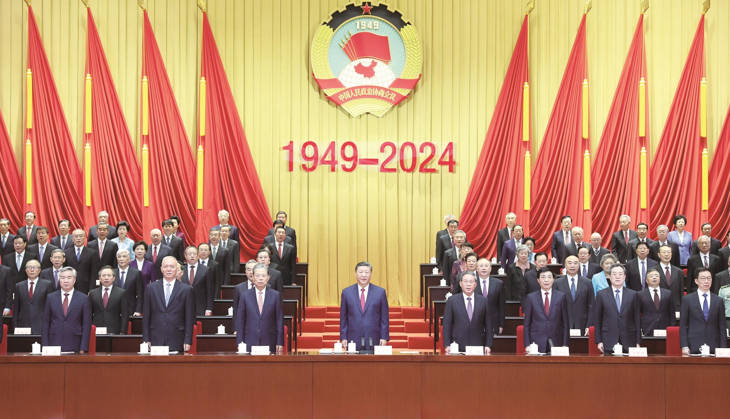 9月20日上午,中共中央、全国政协在全国政协礼堂隆重举行庆祝中国人民政治协商会议成立75周年大会。习近平、李强、赵乐际、王沪宁、蔡奇、丁薛祥、李希、韩正等出席大会。新华社记者 鞠鹏 摄