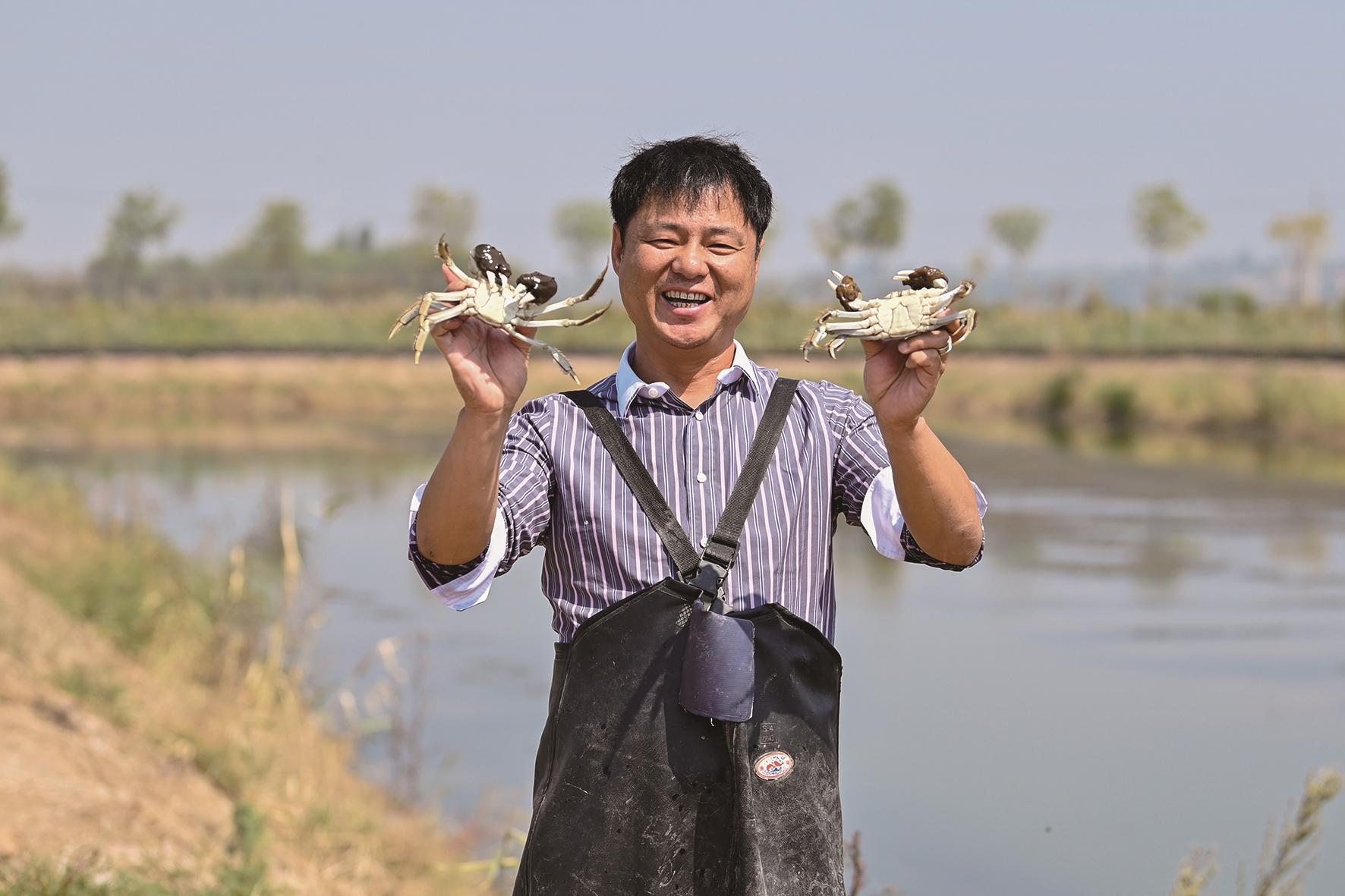在运城市临猗县孙吉镇薛公村,工作人员展示刚捕捞的大闸蟹(9月24日摄)。