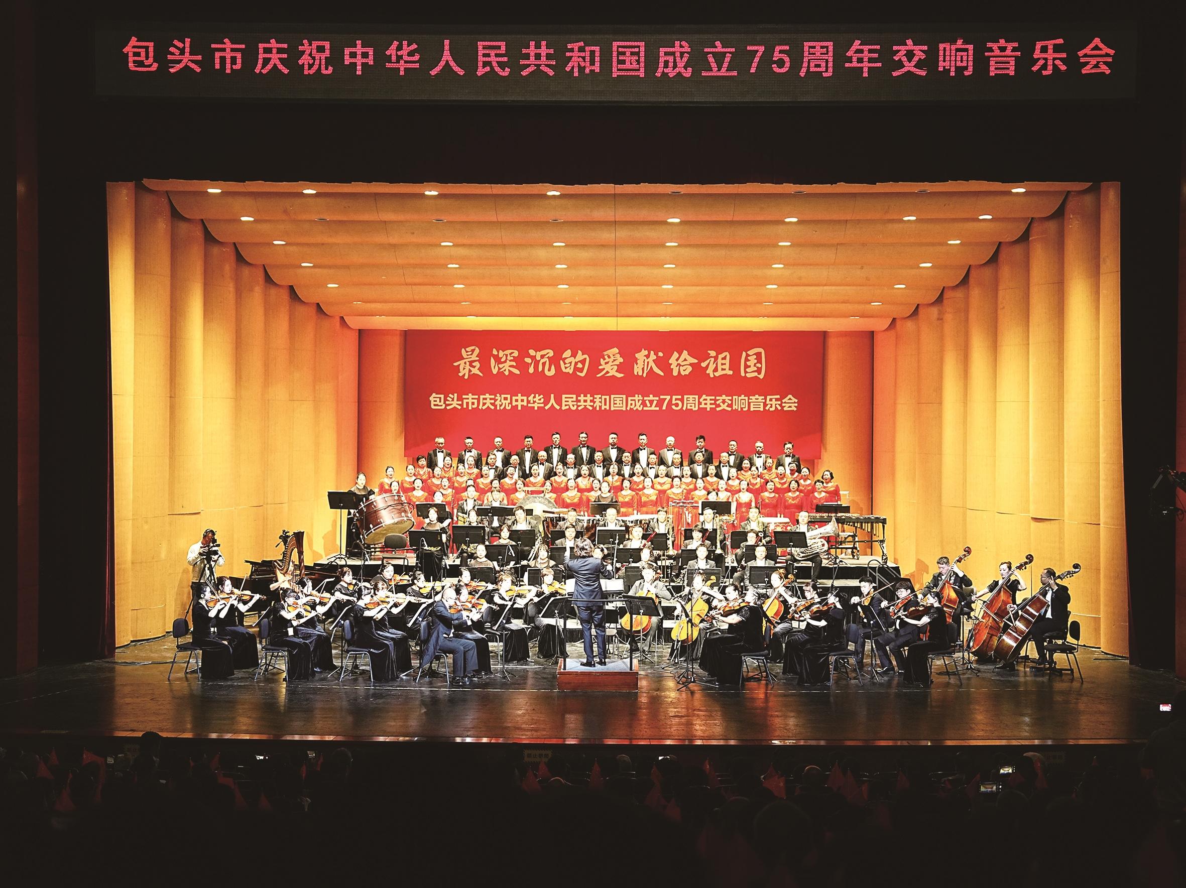 本报讯 交响乐的磅礴气势震撼全场,高亢嘹亮的歌声在城市上空飘荡。9月27日晚,由市委宣传部、市文化旅游广电局主办,市艺术剧院、市融媒体中心和包头文旅集团承办,市艺术剧院交响乐团与歌舞团联袂演出的包头市庆祝中华人民共和国成立75周年交响音乐会“最深沉的爱献给祖国”在包头大剧院燃情奏响。