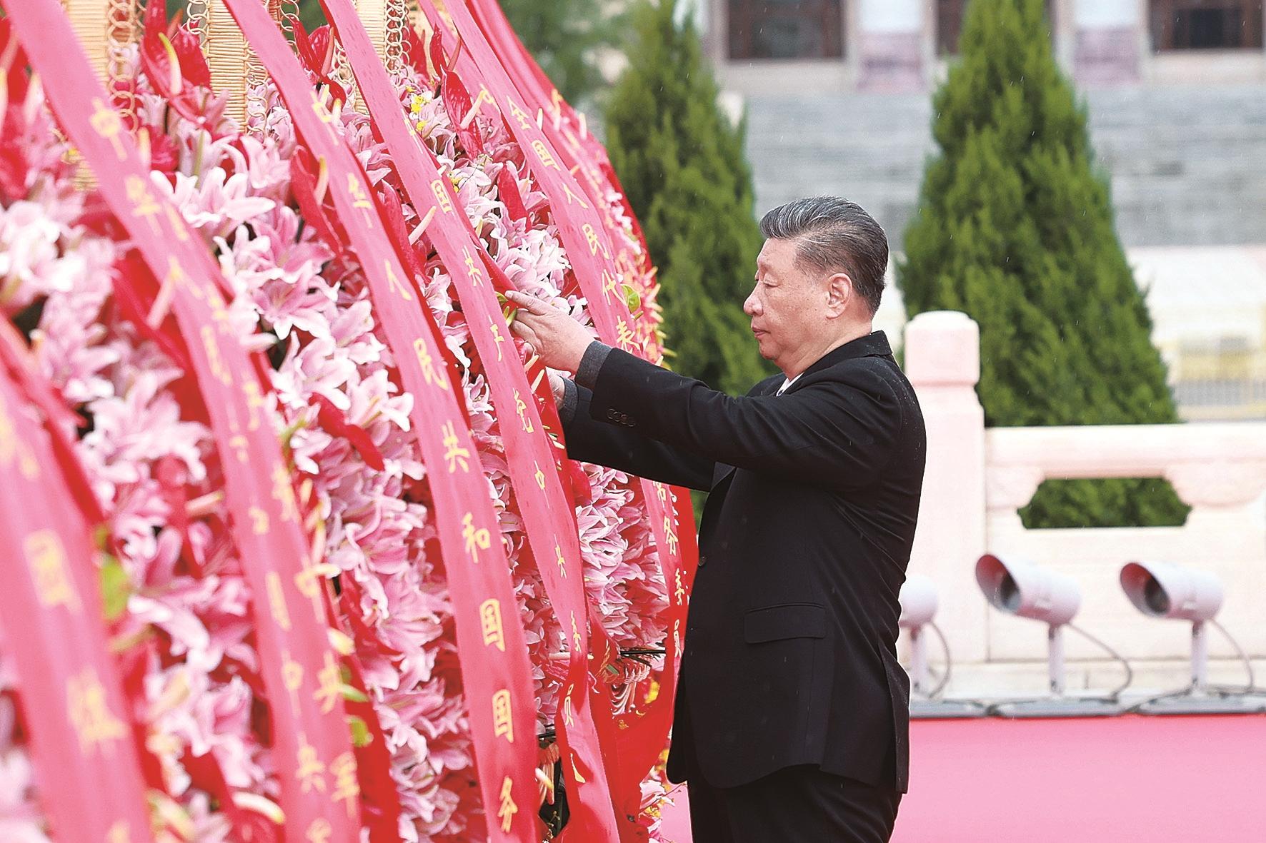 9月30日上午,党和国家领导人习近平、李强、赵乐际、王沪宁、蔡奇、丁薛祥、李希、韩正等来到北京天安门广场,出席烈士纪念日向人民英雄敬献花篮仪式。这是习近平整理花篮上的缎带。新华社记者 王晔 摄