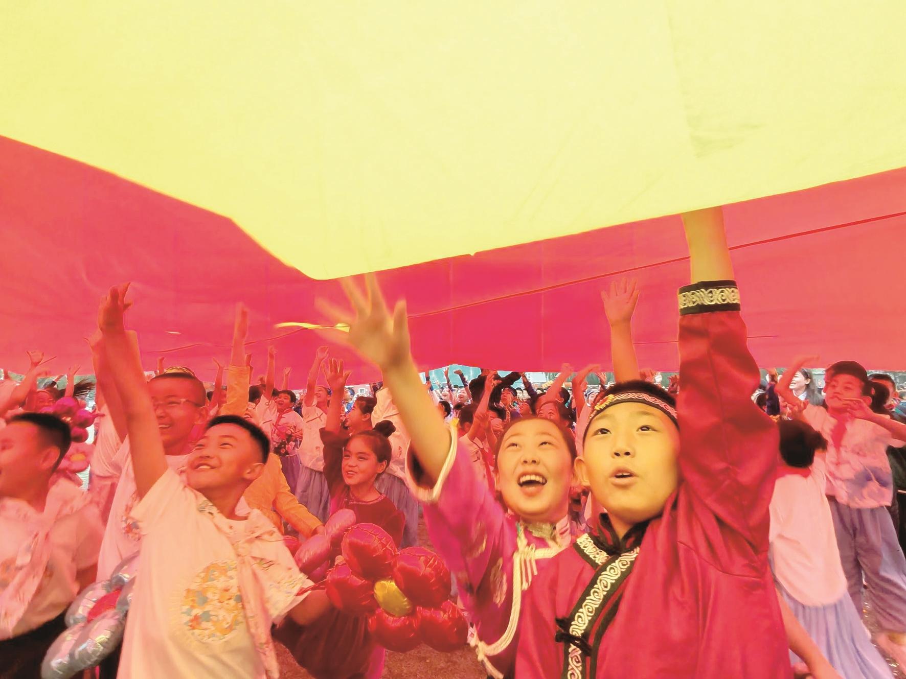 孩子们举起双手抚摸鲜红的国旗。