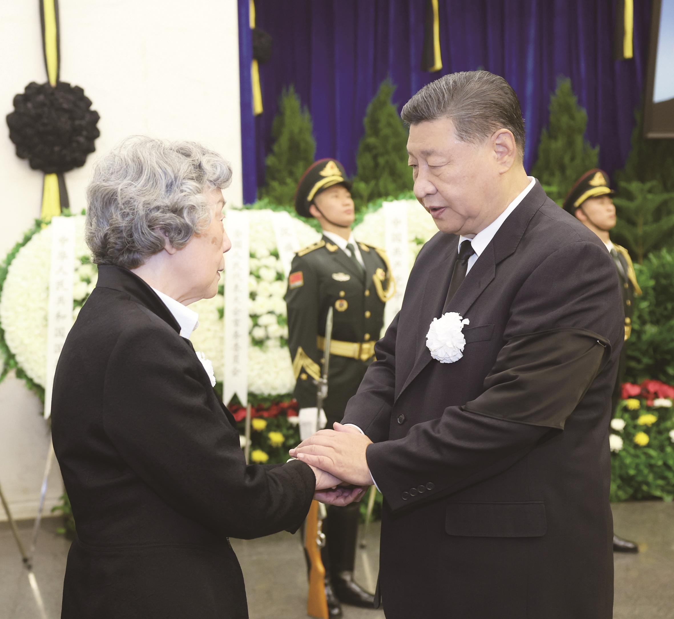 10月14日,吴邦国同志遗体在北京八宝山革命公墓火化。习近平、赵乐际、王沪宁、蔡奇、丁薛祥、李希、韩正等前往八宝山送别,胡锦涛送花圈表示哀悼。这是习近平与吴邦国亲属握手,表示深切慰问。新华社记者 鞠鹏 摄
