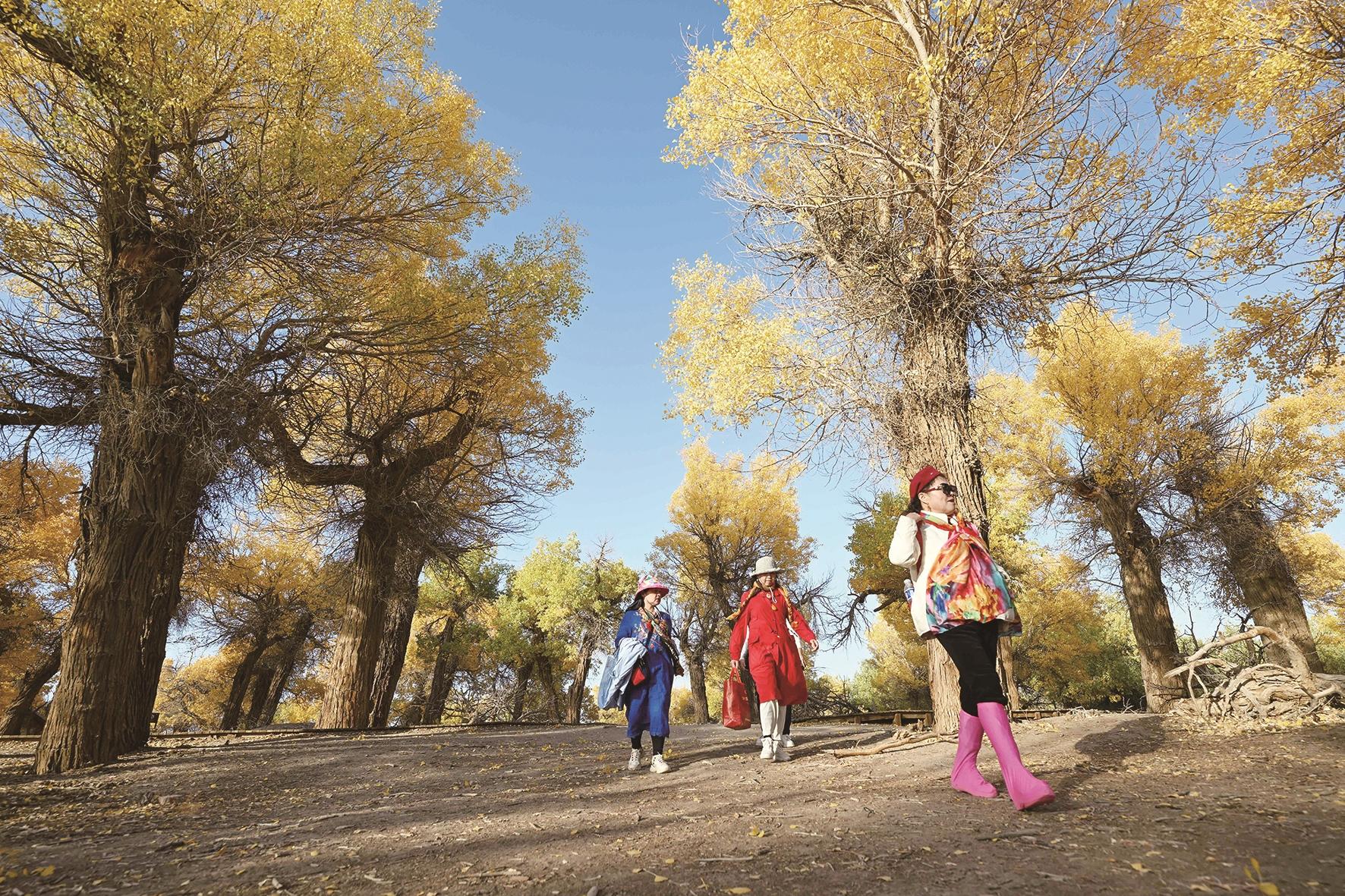 10月13日,游客在内蒙古阿拉善盟额济纳旗大漠胡杨林景区游玩。