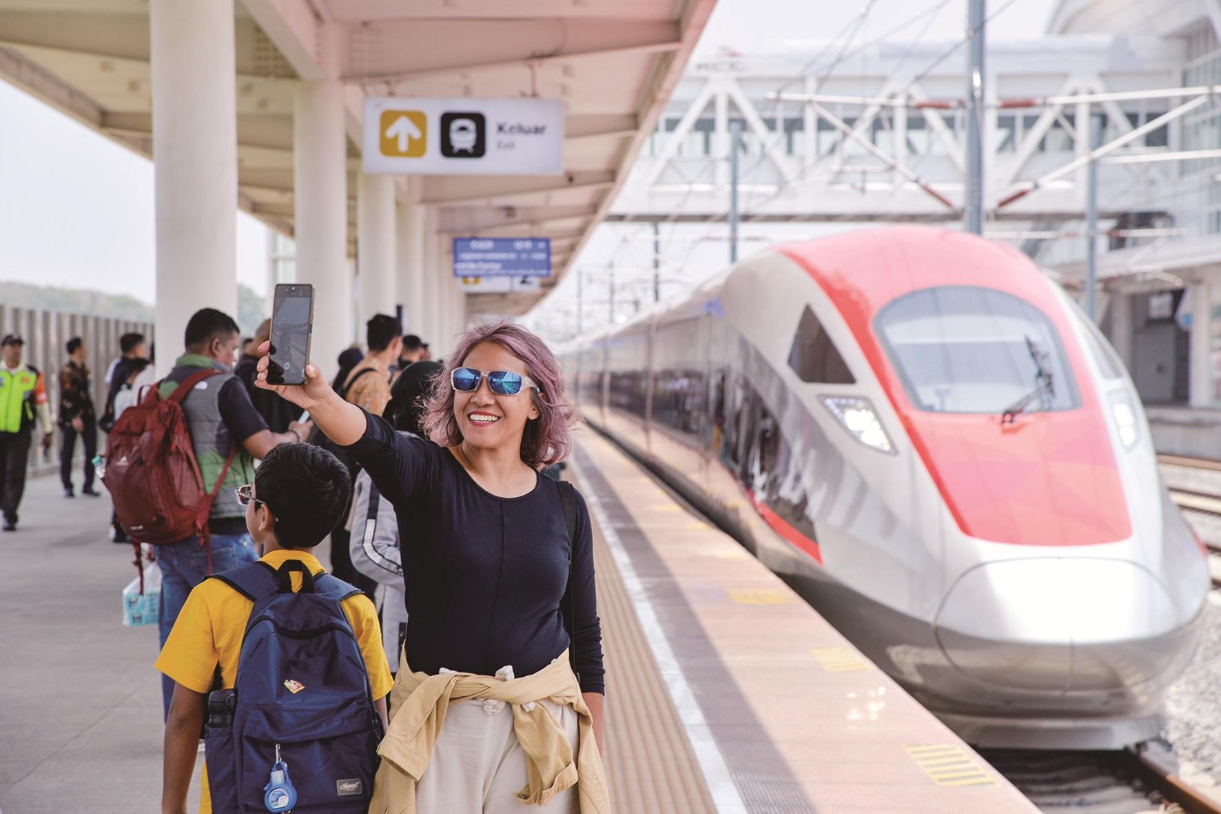 10月17日,在印度尼西亚帕达拉朗站,乘客在雅万高铁高速动车组前自拍。