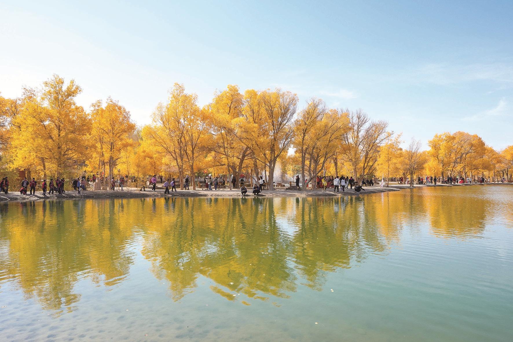 金秋时节,位于甘肃省酒泉市金塔县的金塔沙漠胡杨林景区迎来最佳观赏季,金黄的胡杨林与蓝天、湖泊交相辉映,美如画卷。新华社记者 陈晔华 摄