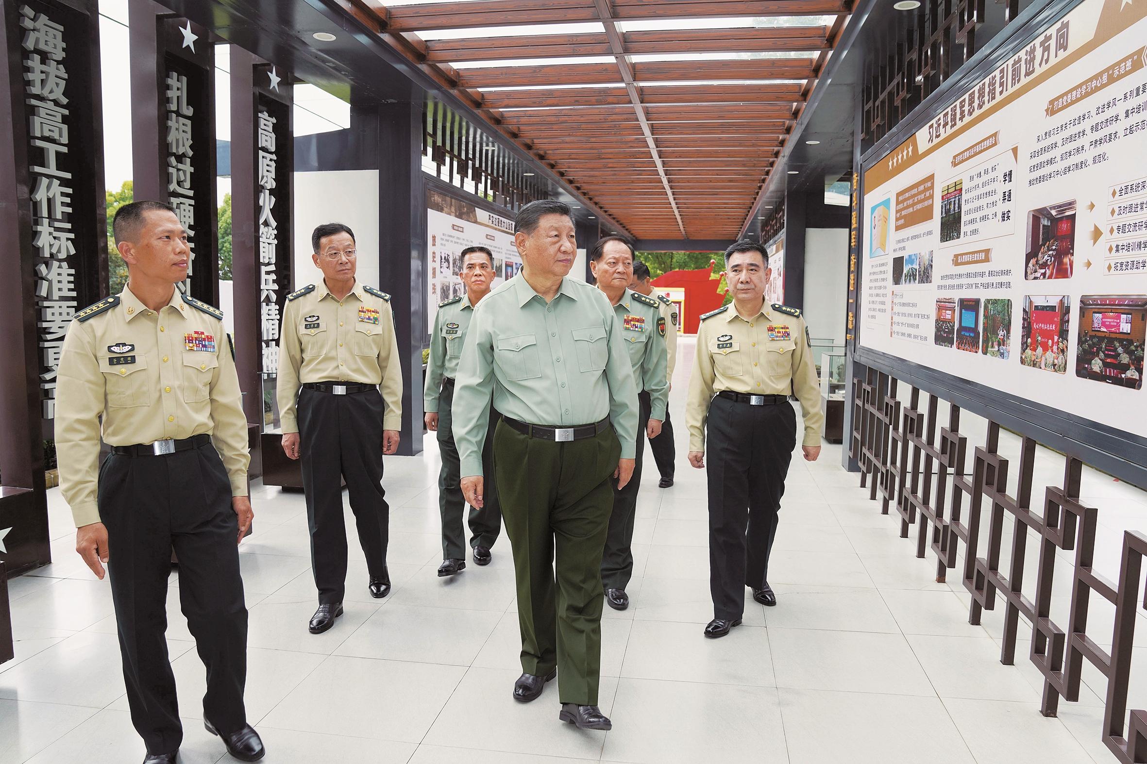 金秋十月,江淮大地山水秀丽、风景如画。上午11时许,习近平来到火箭军某旅,首先察看了该旅军史长廊。该旅是一支有着50多年光荣历史的战略导弹部队。党的十八大以来,该旅在习近平强军思想指引下,坚定举旗铸魂,大抓实战化训练,出色完成一系列重大任务。在反映部队发展历程、新时代全面建设的展板前,习近平详细了解官兵学习党的创新理论、加紧练兵备战、弘扬优良传统等情况。
