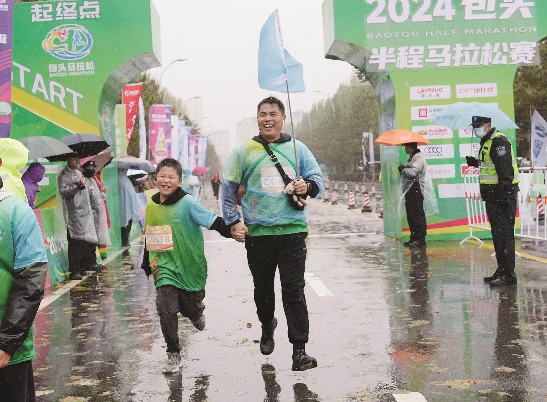 赛道上,选手们活力满满,有的身着亲子服装,拿着手机边跑边拍;有的全家总动员,欢声笑语一路向前……昆都仑区居民陈思宁一家三口已是第二次参加欢乐跑项目,她的小女儿今年刚上小学五年级。“我们家每次都是全家总动员参赛,让孩子感受坚持、坚韧的马拉松精神。今天虽然下着雨,孩子跑完也感觉有点累,但是我们全家都很有成就感。”陈思宁兴奋地搂着女儿说。