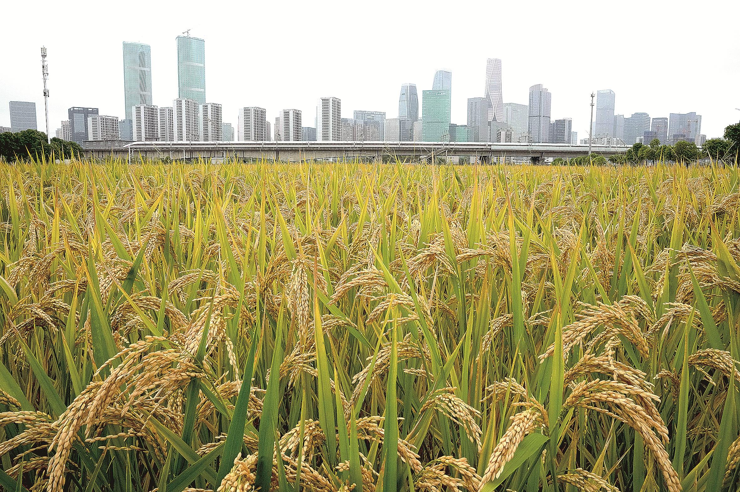 金秋时节,杭州钱江世纪城东侧世纪田园内种植的水稻和高粱渐趋成熟,一派丰收景象,金色稻穗与城市楼群相互呼应。