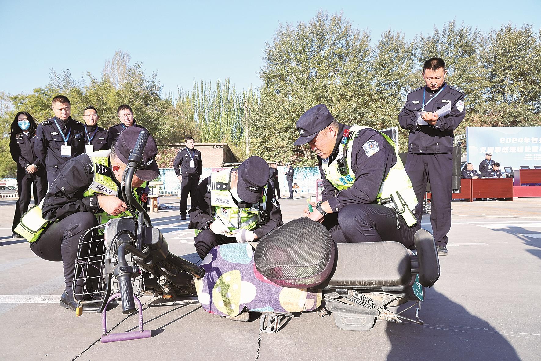 交通事故现场勘查模拟场景依据贴近实战、全面考核的原则进行设置,重点考核各参赛队伍警容风纪、装备使用、现场处置、现场图绘制、现场照相、痕迹物证固定与提取等科目,全面考察参赛人员交通事故现场勘查的能力水平。在装备使用方面,对无人机现场实景俯瞰记录图拍摄、EDR汽车电子数据提取、可疑潜血显现试剂、多波段光源搜索仪等技术应用进行实操检验,全方位展示了现代化的事故勘查技术。