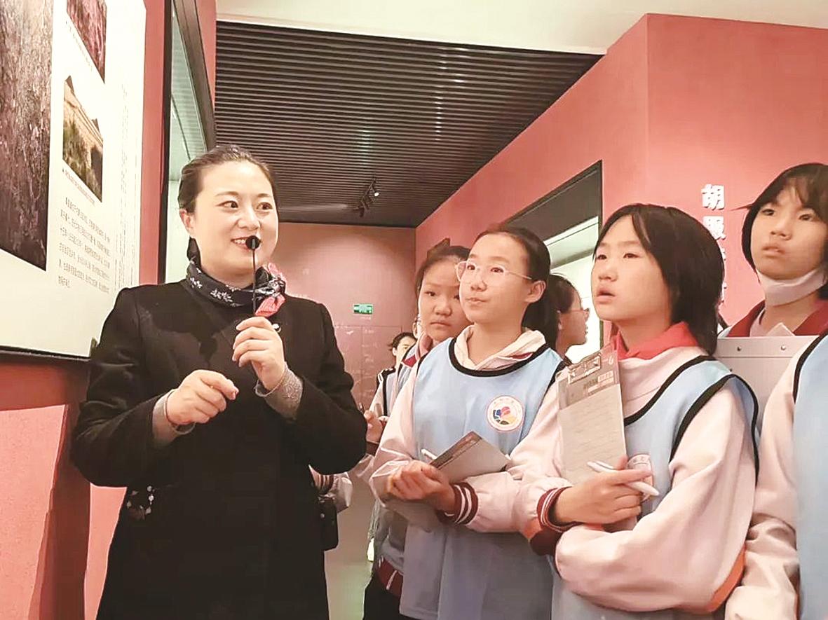讲解员带领学生参观博物馆。