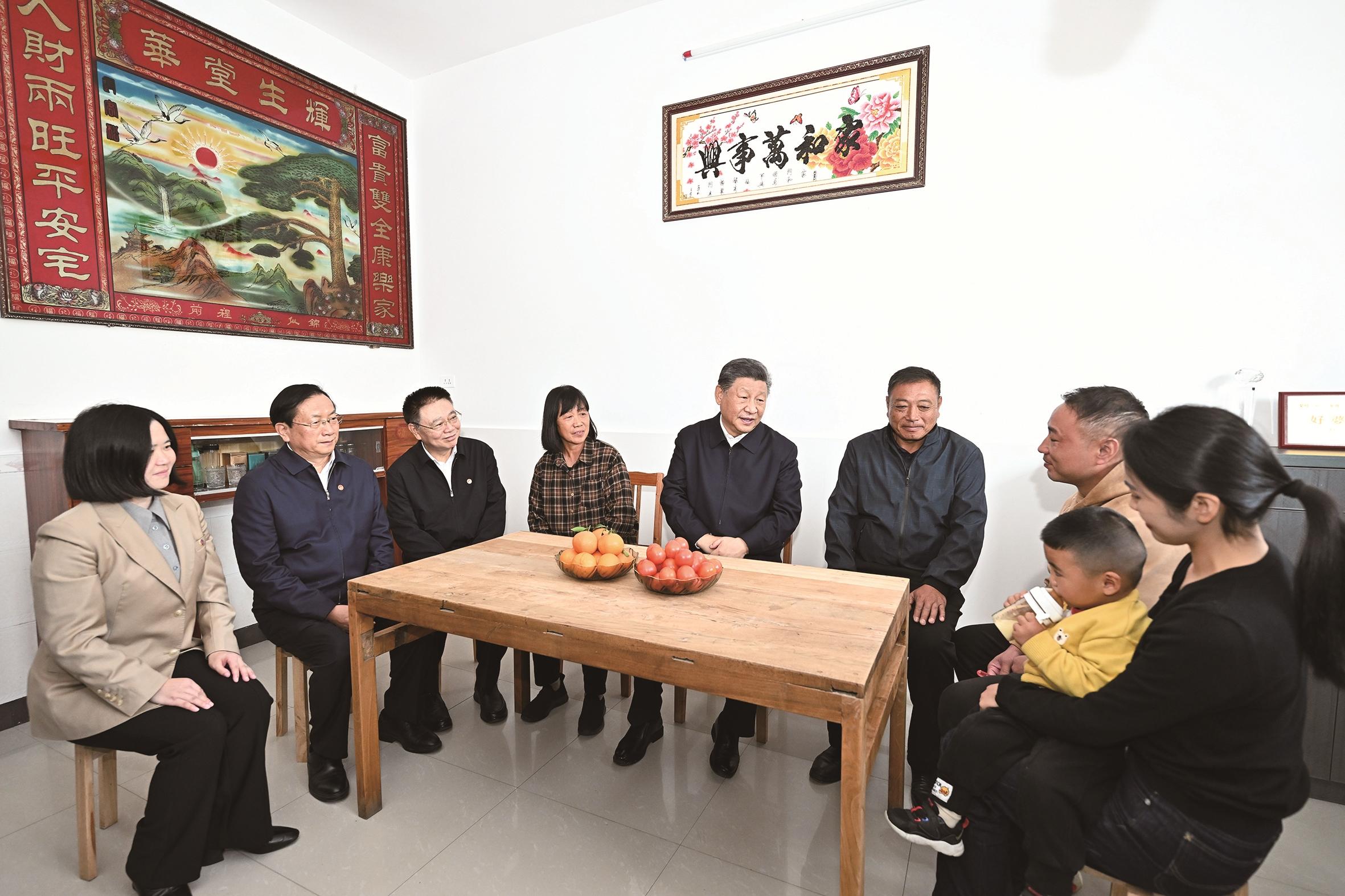 5日上午,习近平在咸宁市嘉鱼县潘家湾镇四邑村村民熊成龙家,同一家人围坐在一起拉家常。新华社记者 燕雁 摄