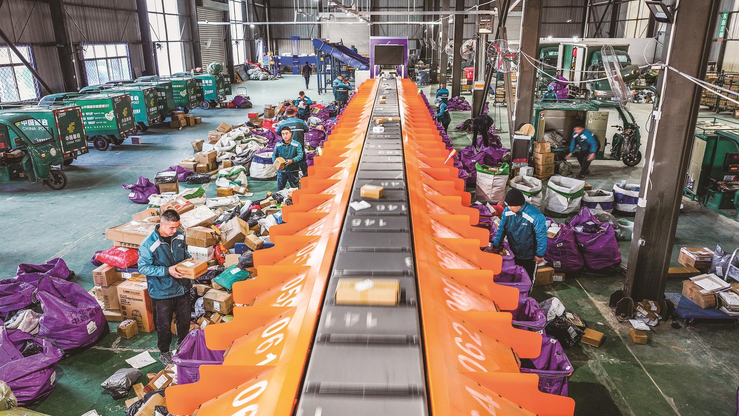 11月5日,在中国邮政集团有限公司河北省遵化市分公司物流中心,工作人员在分拣包裹(无人机照片)。 “双十一”临近,全国各地生产企业开足马力、备足货源,物流企业腾仓扩容、增强运力,迎接“双十一”购物高峰。新华社发(刘满仓 摄)