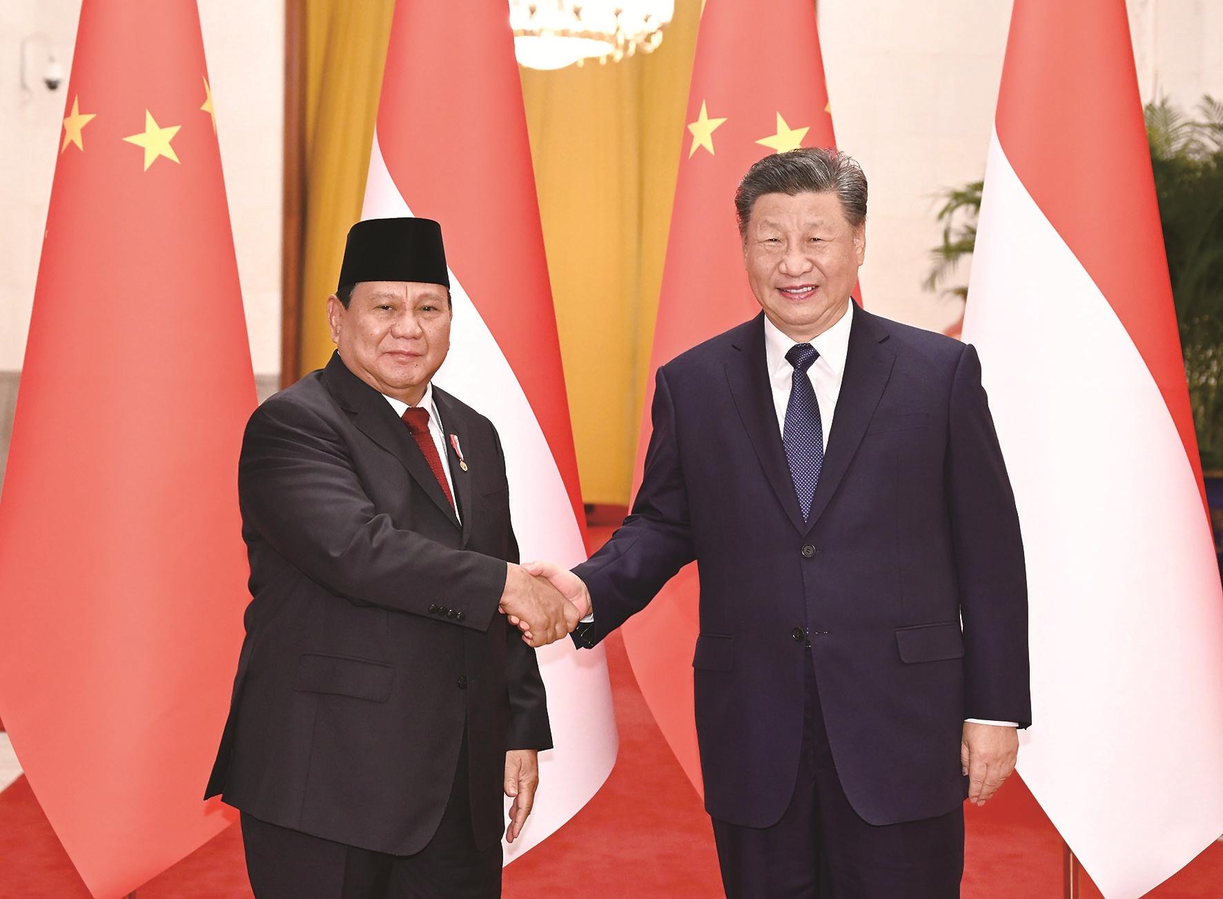 普拉博沃表示,中国是伟大的国家,印尼和中国拥有千年友好交往史,两国关系保持良好发展势头。在当前复杂国际形势下,印尼希望进一步强化同中国全方位战略协作,成为更加紧密的全面战略伙伴,构建具有地区和全球影响力的命运共同体,这将不仅造福两国人民,也为亚洲地区更好实现和平发展营造良好环境。印尼愿同中方继续高质量共建“一带一路”,完善“五大支柱”合作格局,加强基础设施、能矿、医药、农业、住房、海上共同开发、粮食安全、减贫等全方位全产业链合作,欢迎中国企业赴印尼投资。印尼完全支持中国政府在台湾问题上的立场,坚定奉行一个中国政策,坚定支持中国政府为捍卫领土完整、实现国家统一所作努力。涉疆事务完全是中国内政,印尼坚持不干涉内政原则,坚定支持中方为维护新疆发展稳定所作努力。感谢中方在巴勒斯坦问题上主持公道正义。印尼坚持独立自主,坚持不结盟外交政策,不加入任何针对第三方的军事同盟或“小圈子”,支持习近平主席提出的三大全球倡议,愿同中方密切在二十国集团等多边框架内沟通协作,为维护全球南方共同利益、促进世界多极化、推动构建人类命运共同体作出积极努力。下转04