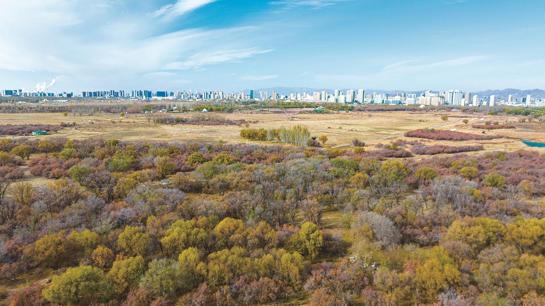 天高云淡,远眺赛汗塔拉城中草原,色彩缤纷的红柳、一望无际的芦苇、笔直挺拔的杨树、鳞次栉比的高楼,草原风光与现代都市完美融合,让人流连忘返。记者 李强 摄