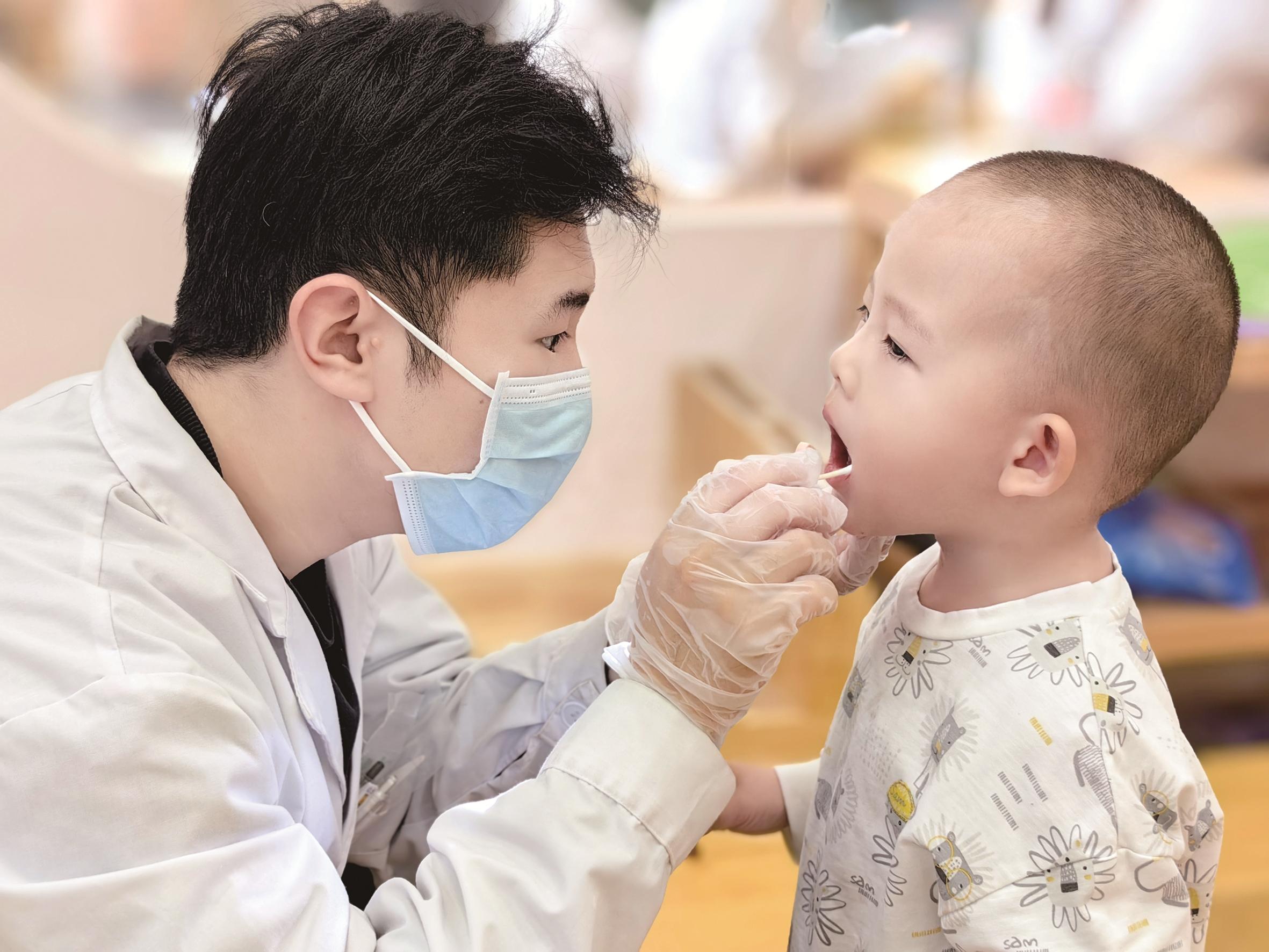 图为医生在为幼儿检查口腔。