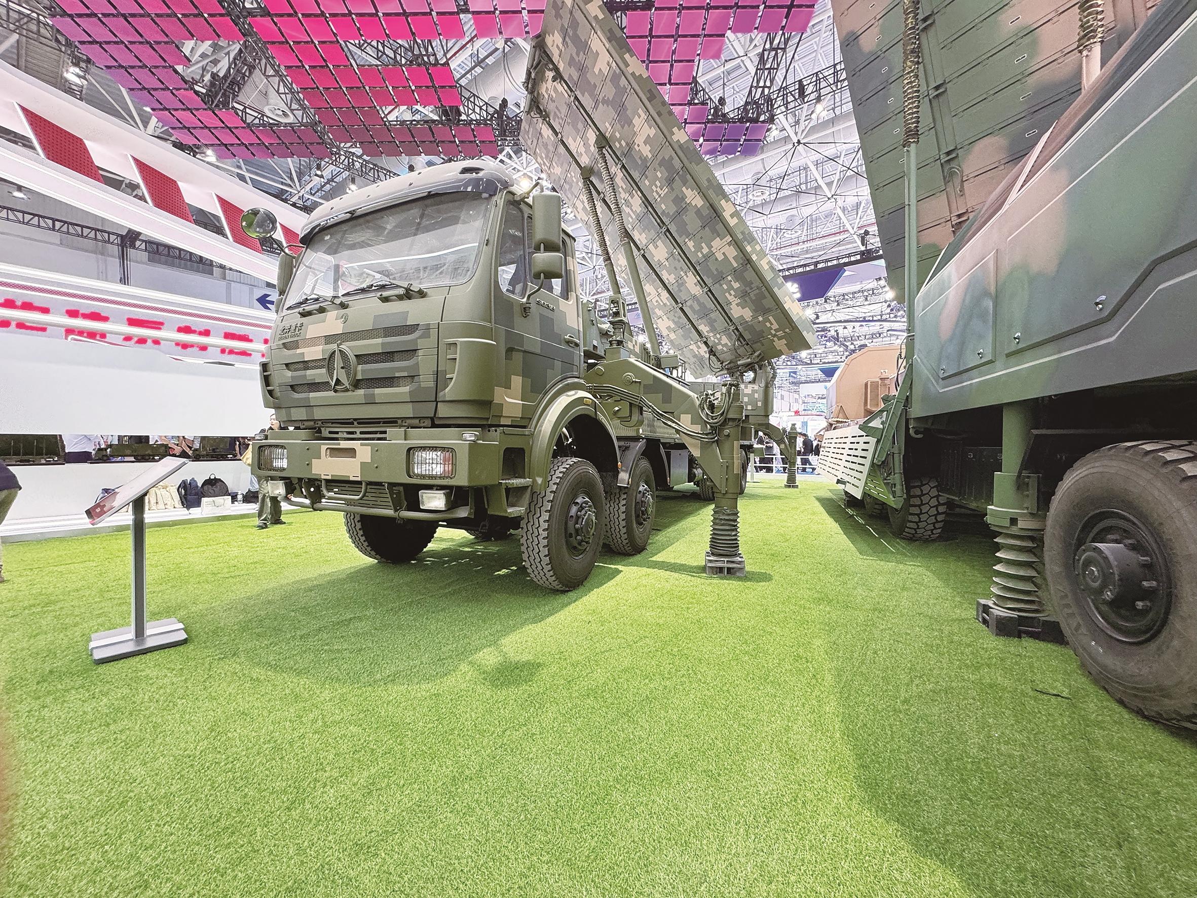 其中,由5台北奔重卡搭载的野战机动指挥所、通用营/连指挥所、通信服务站等在兵器展馆展出,2台北奔重卡搭载的蜂群陆战装备、特种雷达在其他展馆展出,4台北奔重卡搭载的各种波段雷达、蜂群装备和1台北奔重卡搭载的情报雷达在室外展区展出。