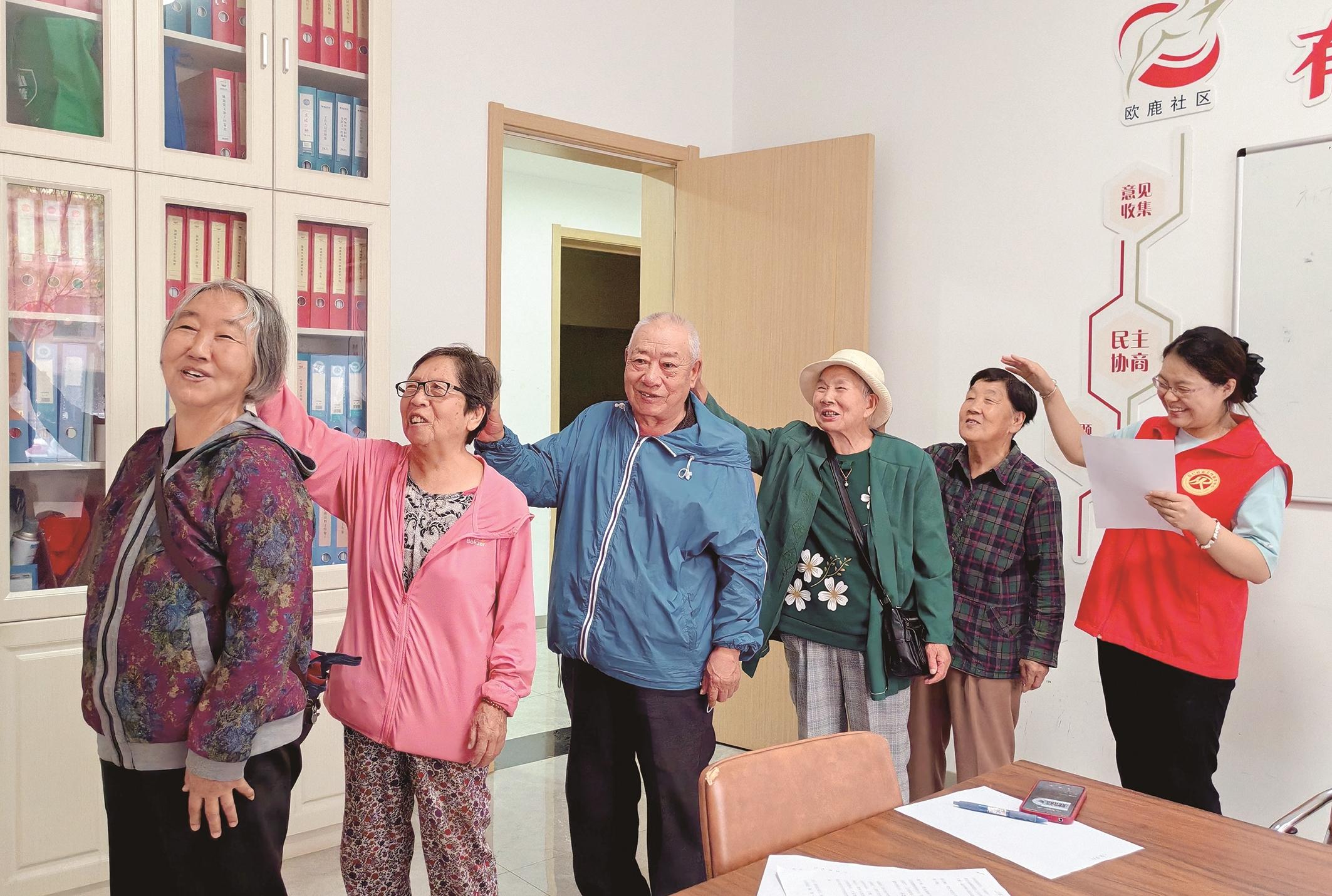 图为志愿者带领老人们一起做减压操。