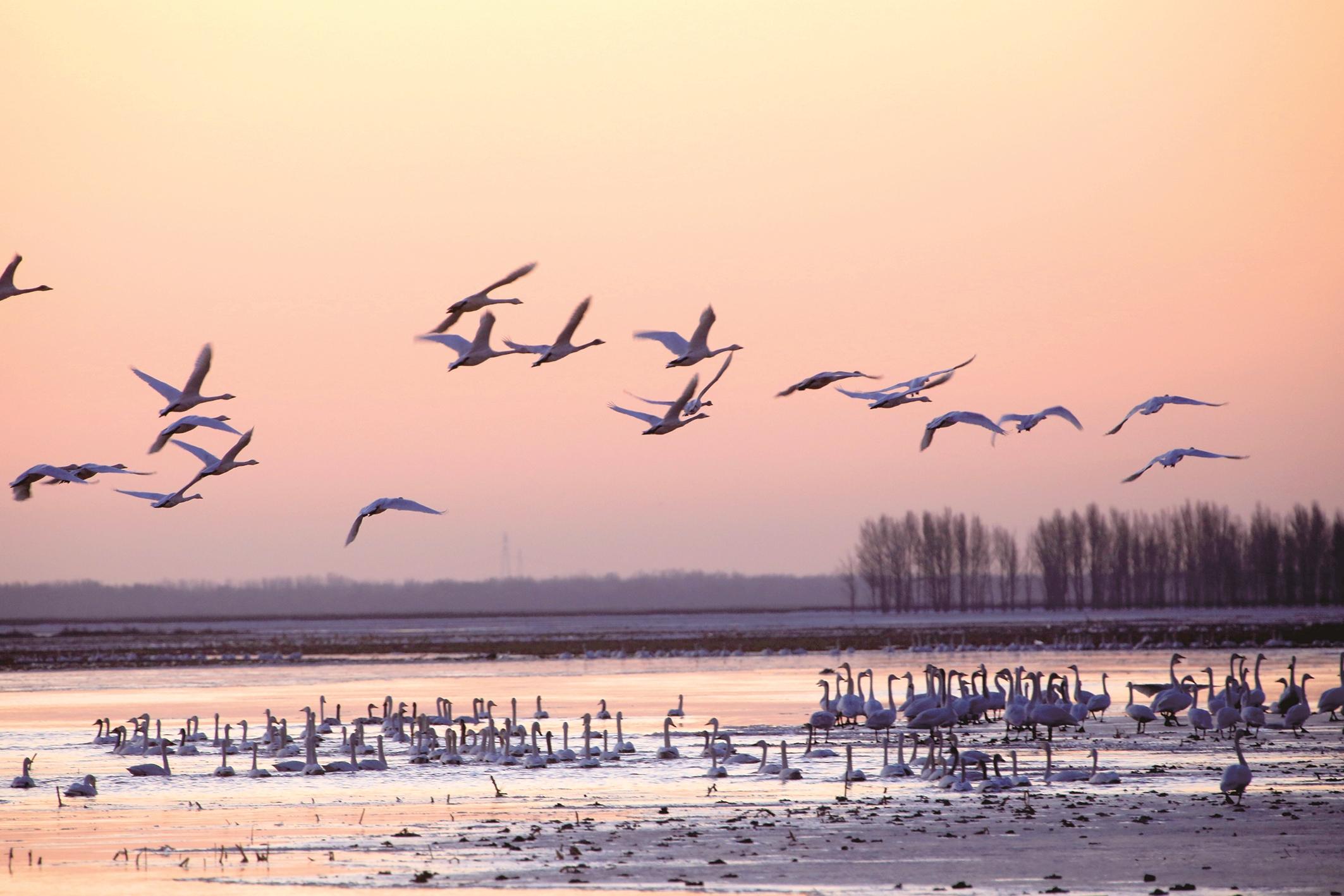秋天,黄河宁静而深邃。河水缓缓流淌,映照着天空中变幻的云彩。落日余晖洒在河面上,泛起一片橙红,美得如诗如画。此时,天鹅再次途经包头,在黄河旁的湿地嬉戏、觅食。此时的黄河,壮美中蕴含着诗意与律动的浪漫。