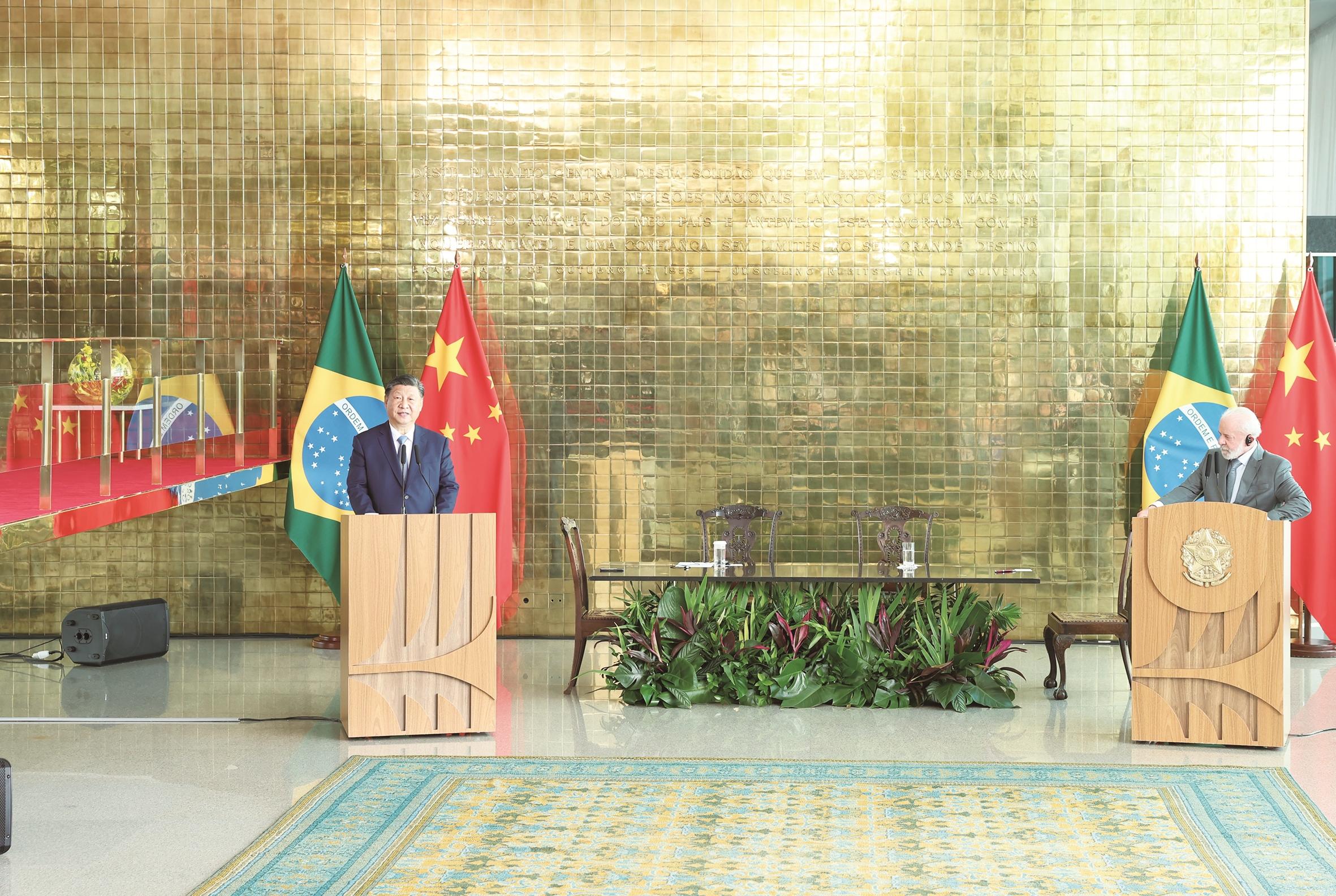 我们就中巴关系未来发展达成新的战略共识,其中最重要的是,我们共同决定将双边关系提升为携手构建更公正世界和更可持续星球的中巴命运共同体,同时将共建“一带一路”倡议同巴西发展战略对接。在世界格局加速演变的背景下,这体现了中巴两个发展中大国识变、应变、求变的决心,必将推动两国关系继往开来、开启下一个“黄金50年”,同时为全球南方国家团结自强树立榜样,为提升发展中国家在全球治理中的代表性和发言权作出新的贡献。