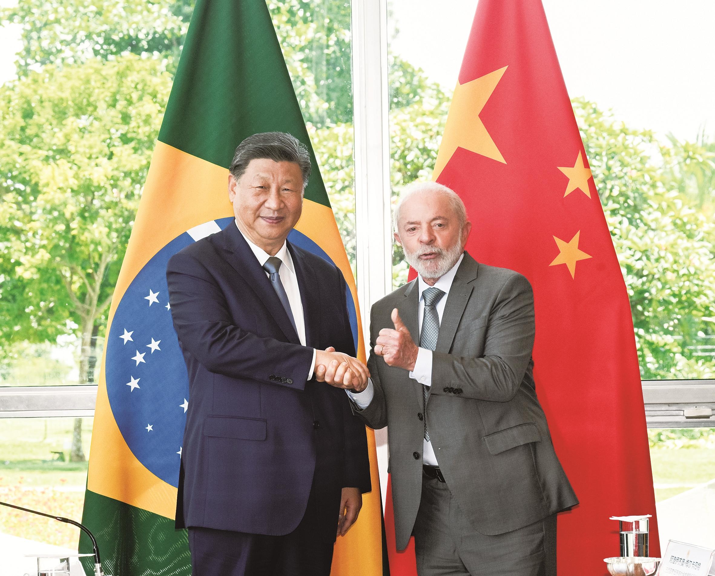 习近平指出,很高兴在中巴建交50周年这个具有重要历史意义的年份访问巴西。刚才卢拉总统为我举行最高礼遇的隆重欢迎仪式,充分体现了对中巴关系的高度重视以及对中国人民的深情厚谊,令我深受感动。中国和巴西是东西半球两大发展中国家。回首过去50年,中巴关系跨越山海,探索出发展中大国相互尊重、互利友好、合作共赢的正确相处之道。巴西是首个同中国建立战略伙伴关系的国家、首个同中国建立全面战略伙伴关系的拉美国家。近年来,在我和卢拉总统战略引领下,两国日益成为命运与共的可靠朋友、共促和平的积极力量,中巴关系正处于历史最好时期,不仅增进了两国人民福祉,也维护了广大发展中国家共同利益,壮大了全球南方的力量和声音,为世界和平稳定作出突出贡献。