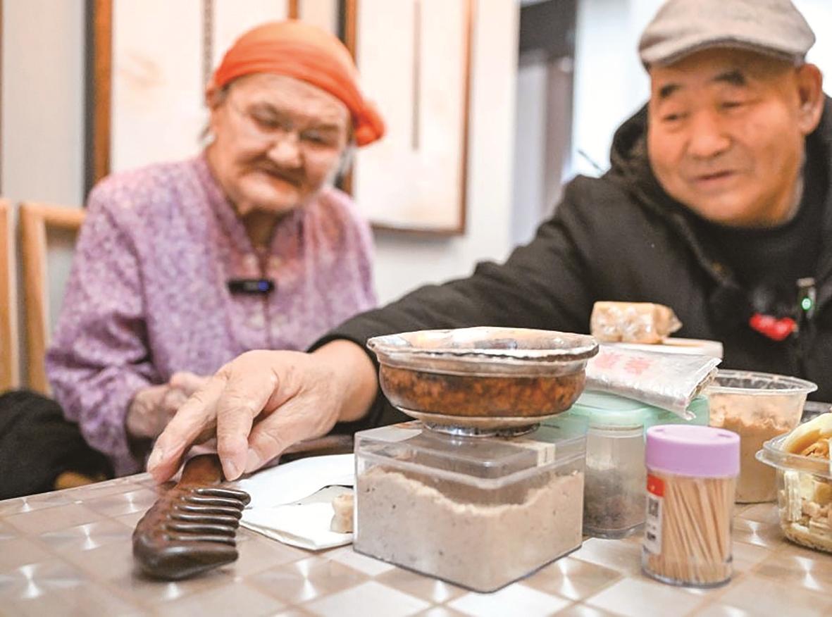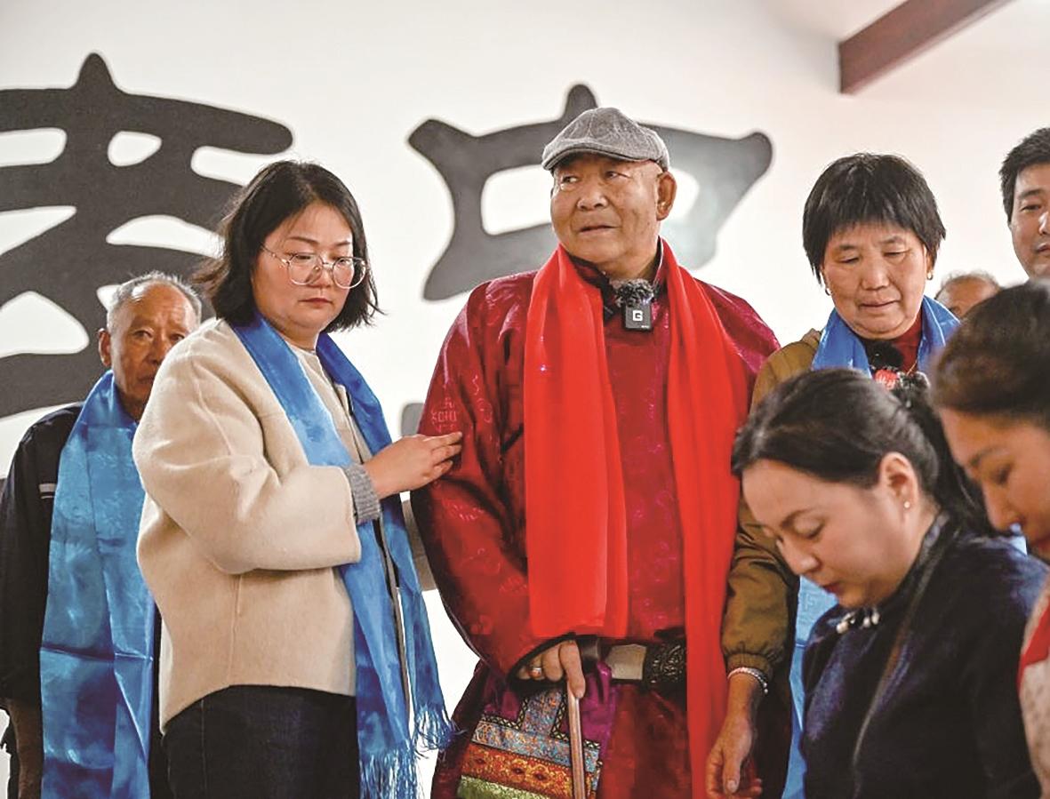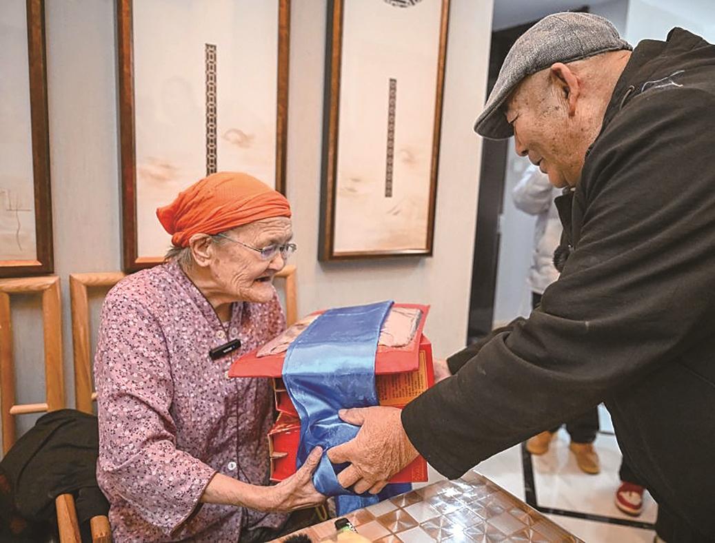 ▲11月20日,扎拉嘎木吉(右)送给都贵玛老人一把从南京买来的梳子。新华社记者连振摄