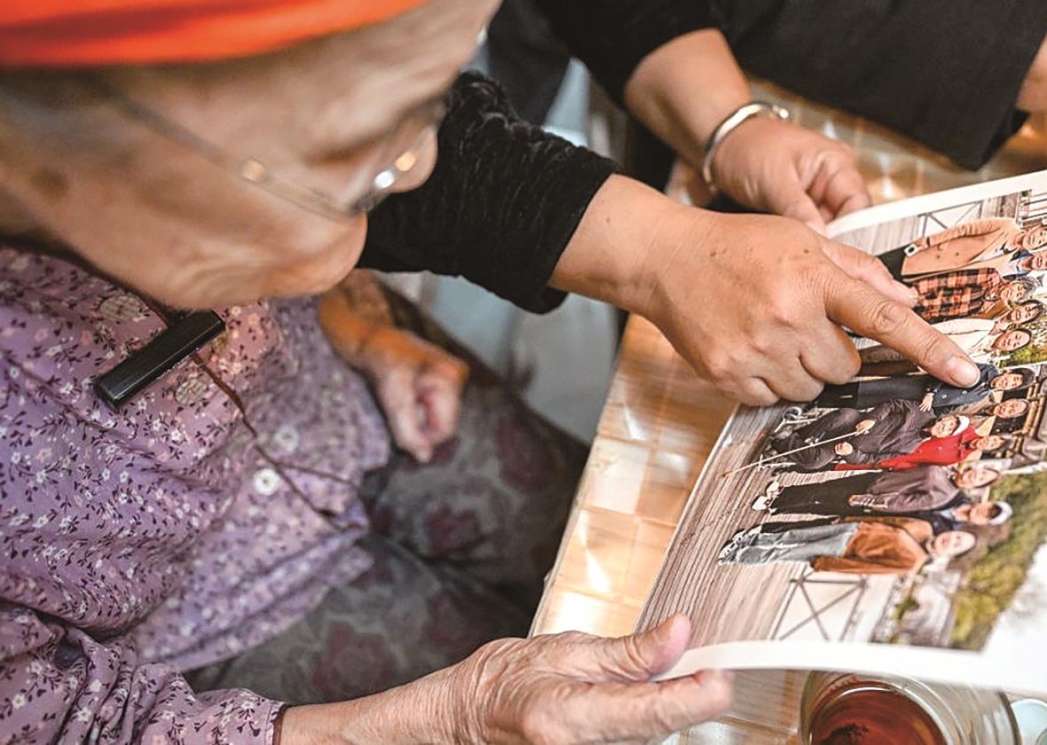 ▲11月20日,扎拉嘎木吉给都贵玛老人介绍自己和江苏亲人的合影。新华社记者连振摄