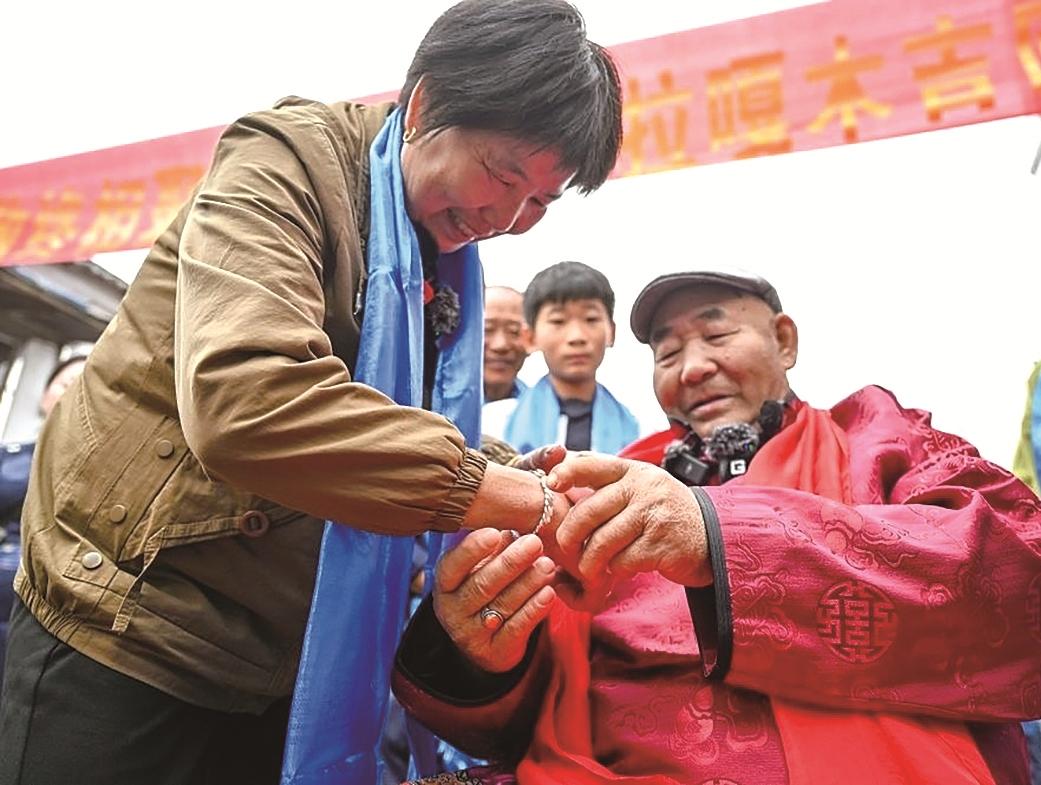 ▲11月16日,扎拉嘎木吉给姐姐戴上他从内蒙古带来的手镯。 新华社记者贺书琛摄