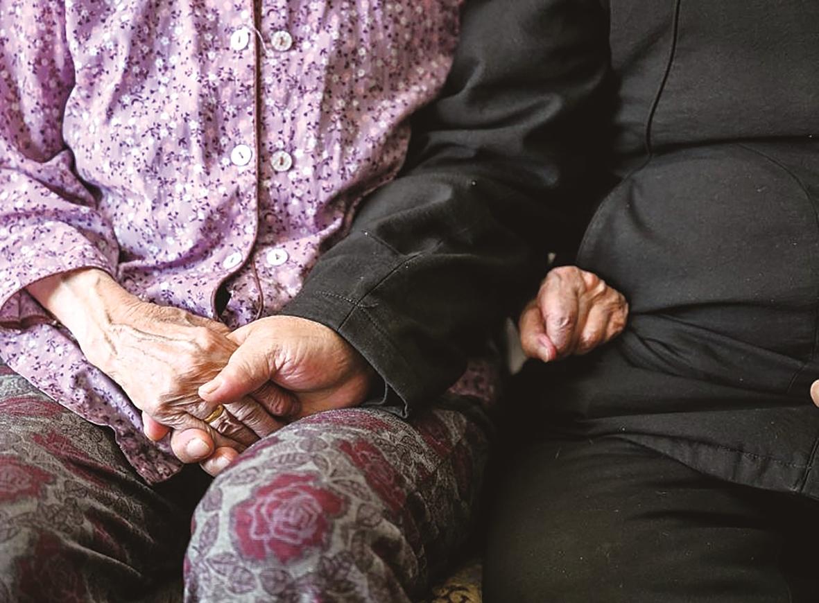 ?11月20日,都贵玛和扎拉嘎木吉(右)合影时,紧握对方的手。 新华社记者 连振摄