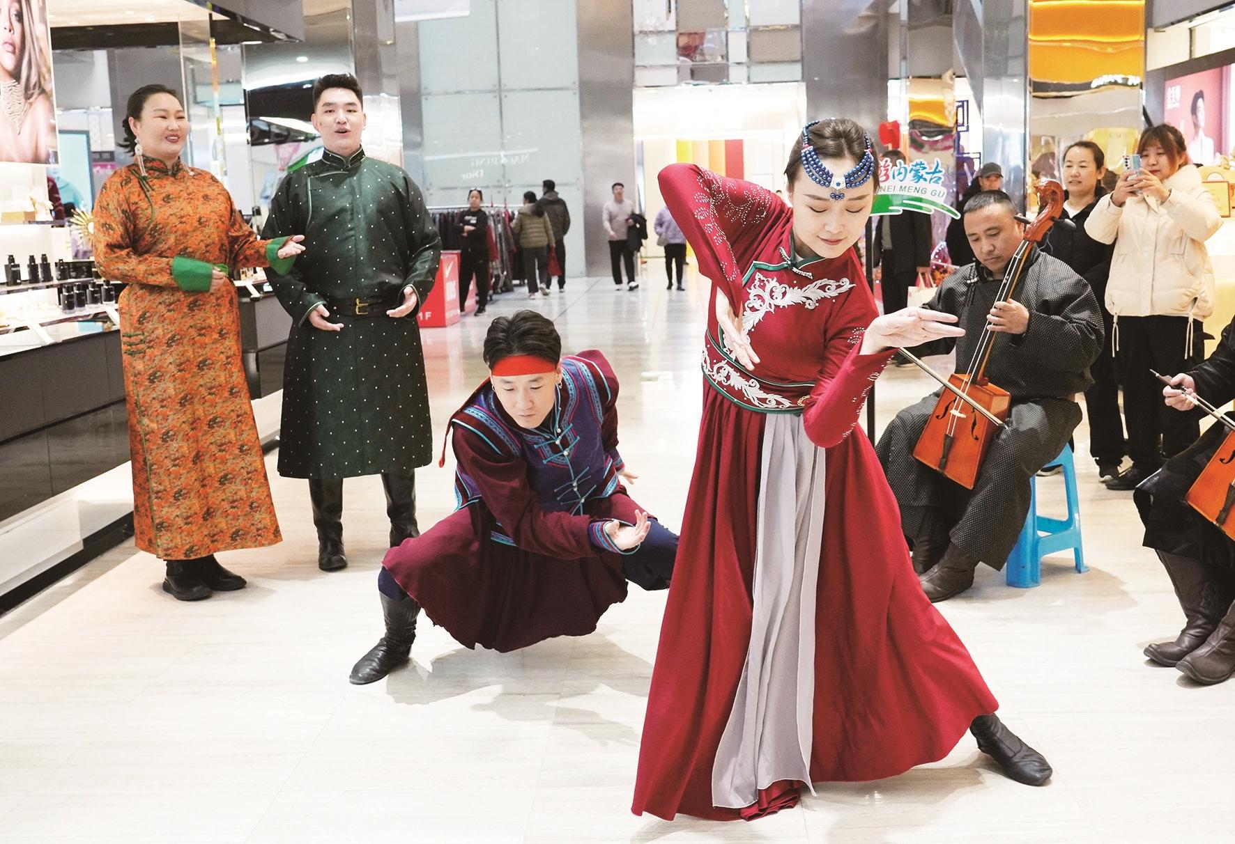 为了让大家提前感受活动的浓厚氛围,11月23日至24日,达茂旗乌兰牧骑走进我市多个商圈、社区和火车站开展了“歌游内蒙古·燃情包头冬季那达慕”快闪主题传播活动。活动现场,悠扬的马头琴旋律、翩翩起舞的舞蹈演员以及高亢嘹亮的长调歌声,共同为广大市民带来了一场视听盛宴。