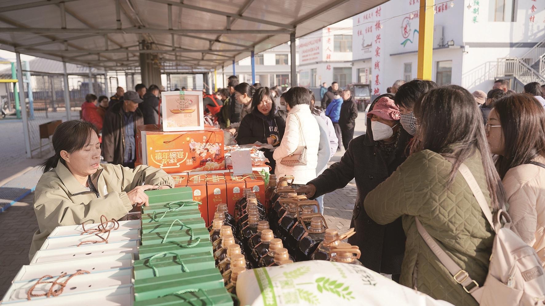 走进活动现场,首先映入眼帘的就是热闹的农副产品展销区,摊位上摆满了周边农户带来的各式特色农产品,有冒着热气的豆腐、新鲜的猪肉,还有手工粉条、开花馒头、胡麻油等,大家穿梭其间,挑选着自己心仪的农副产品。
