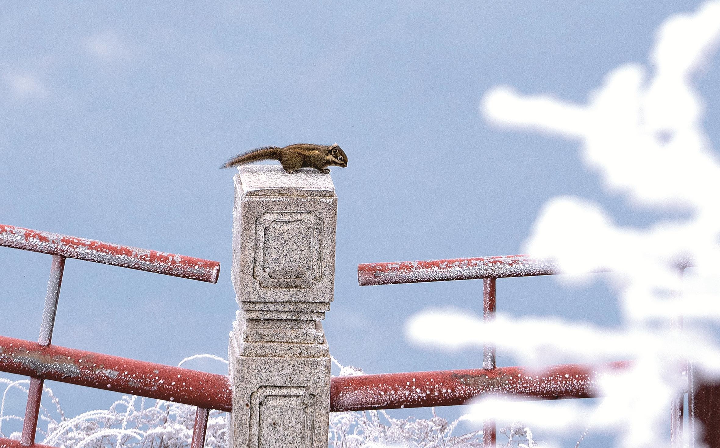 图为一只松鼠在峨眉山金顶金刚嘴觅食。