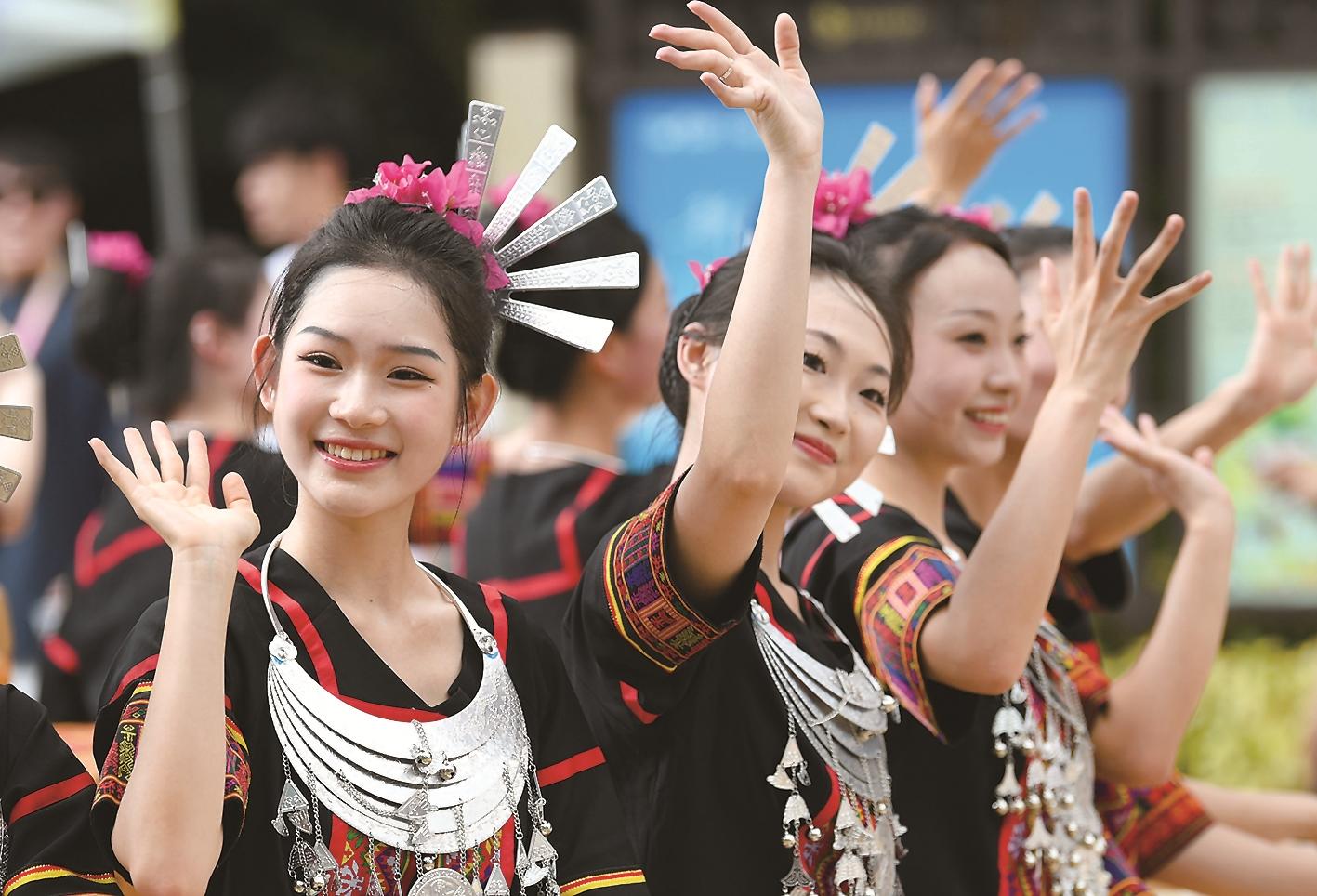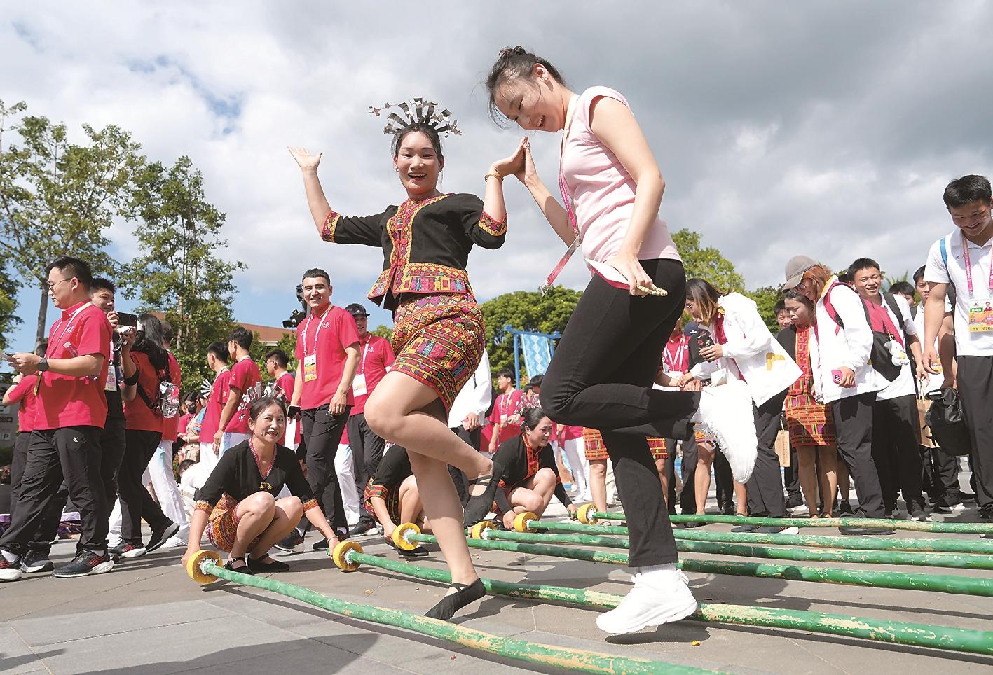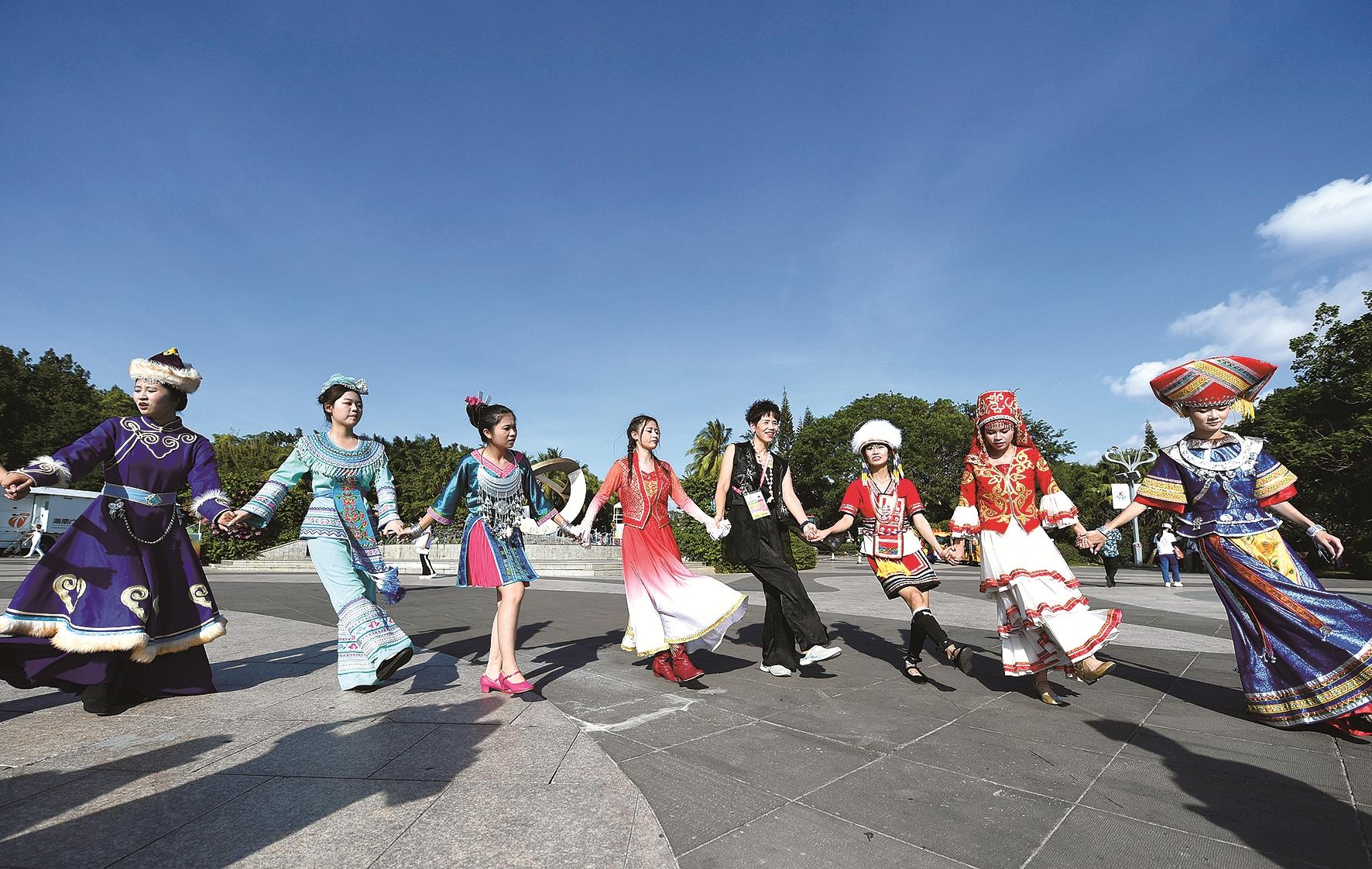 11月26日,演员和代表团成员在民族大联欢活动中。新华社发(杜笑微 摄)