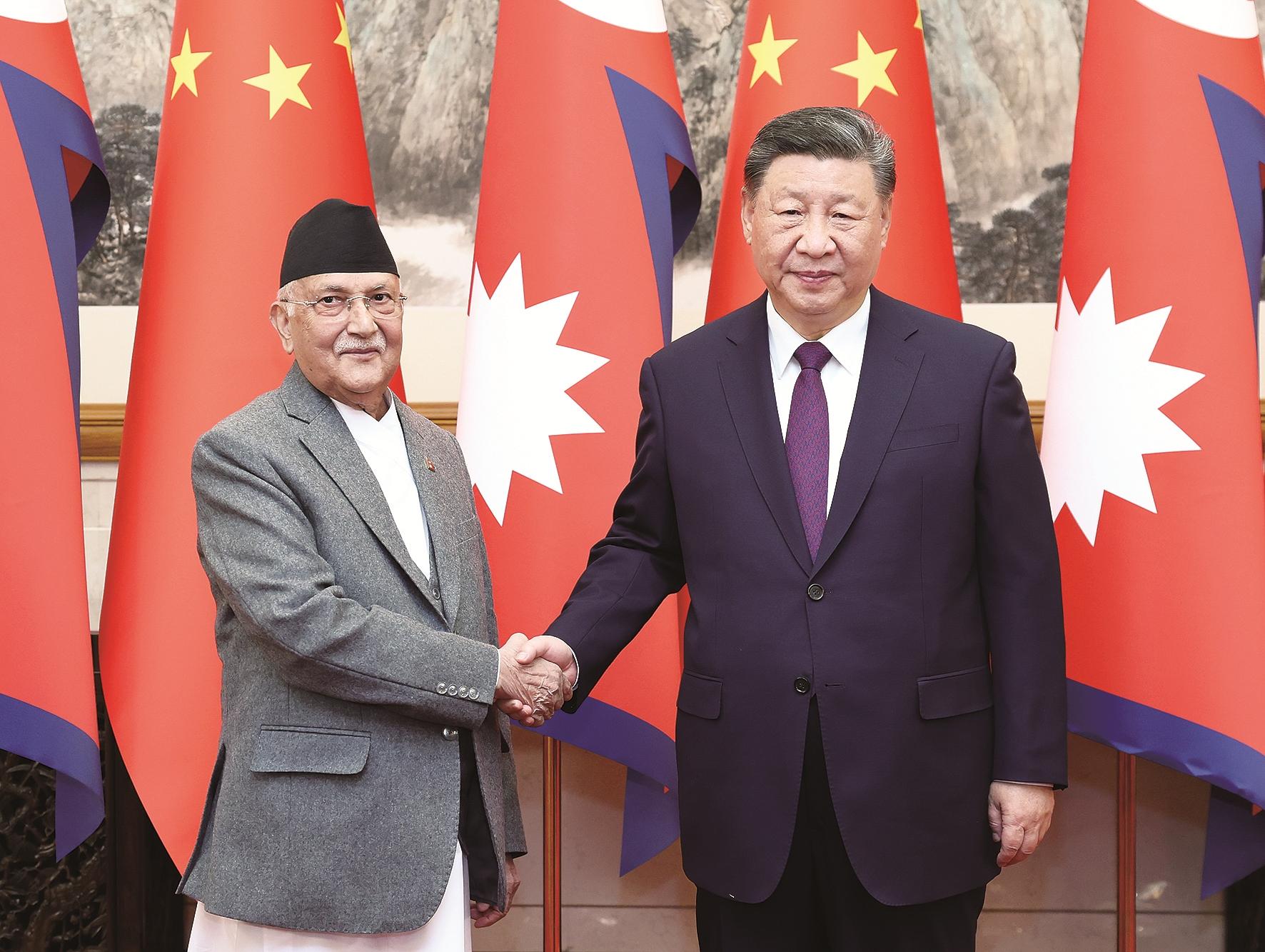 习近平赞赏奥利长期坚定致力于中尼友好事业,指出中国和尼泊尔是山水相连的好邻居、好朋友、好伙伴,两国始终真诚相待、相互尊重、相互支持,双边关系保持健康稳定发展。明年是中尼建交70周年。中方把中尼关系置于周边外交的重要位置,愿同尼方秉持建交初心,巩固传统友谊,推动中尼面向发展与繁荣的世代友好的战略合作伙伴关系取得新的更大发展。
