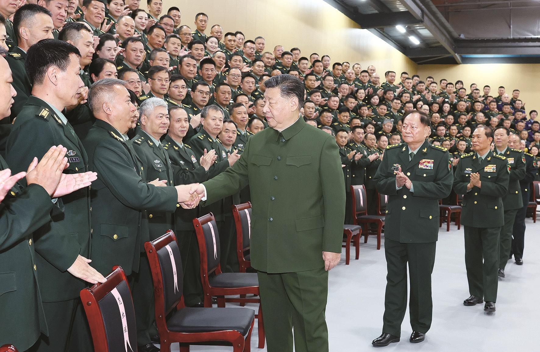 12月4日,中共中央总书记、国家主席、中央军委主席习近平视察信息支援部队,代表党中央和中央军委,对信息支援部队第一次党代表大会的召开表示热烈祝贺,向信息支援部队全体官兵致以诚挚问候。这是习近平同代表们亲切握手。 新华社记者 李刚 摄