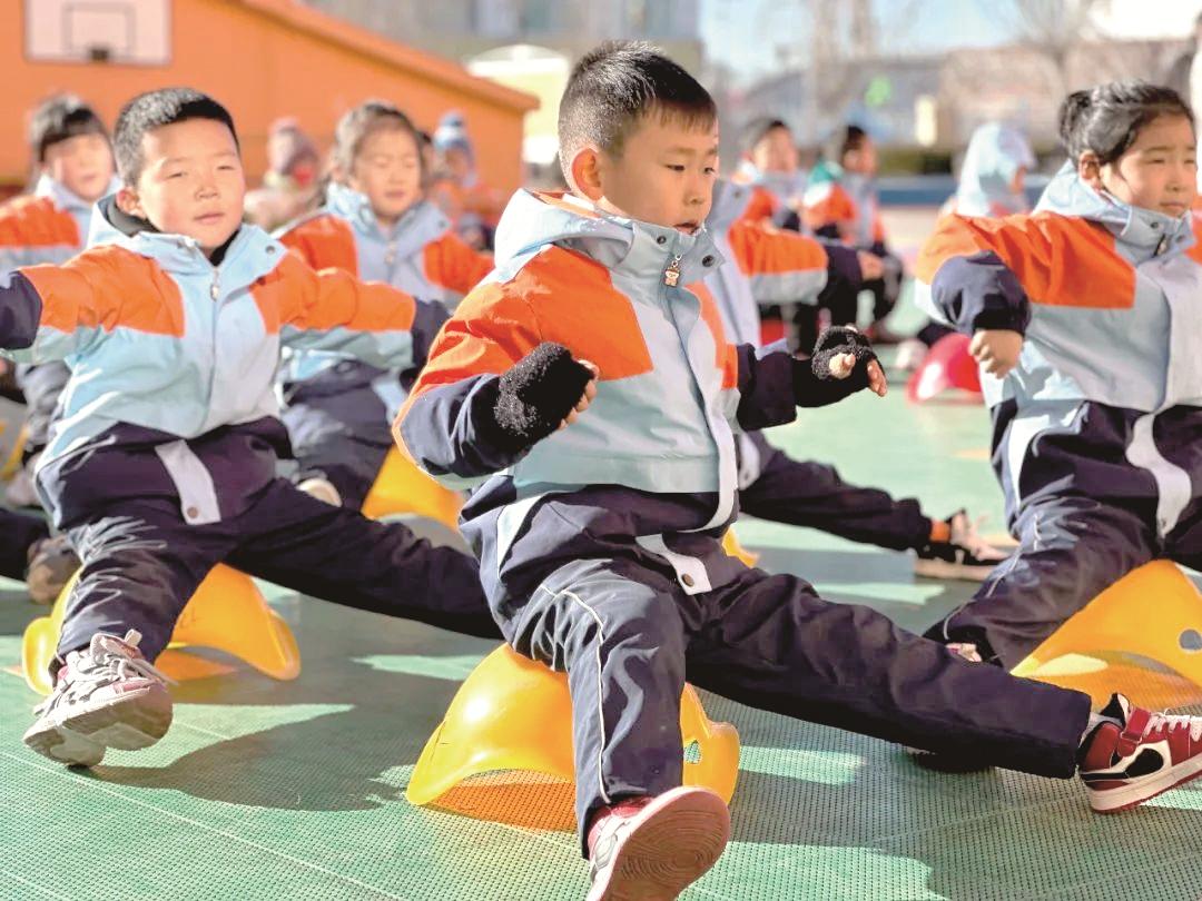 本报讯 在冬日的午后,土右旗第四幼儿园活动场上多项体能运动正在上演。皮筋操、龟背操、跑酷、跳绳……小小的身影在障碍物间穿梭,跳跃,翻滚,伴随着动感的音乐,萌娃们运动热情不减,仿佛一个个小暖阳,温暖了整个校园。