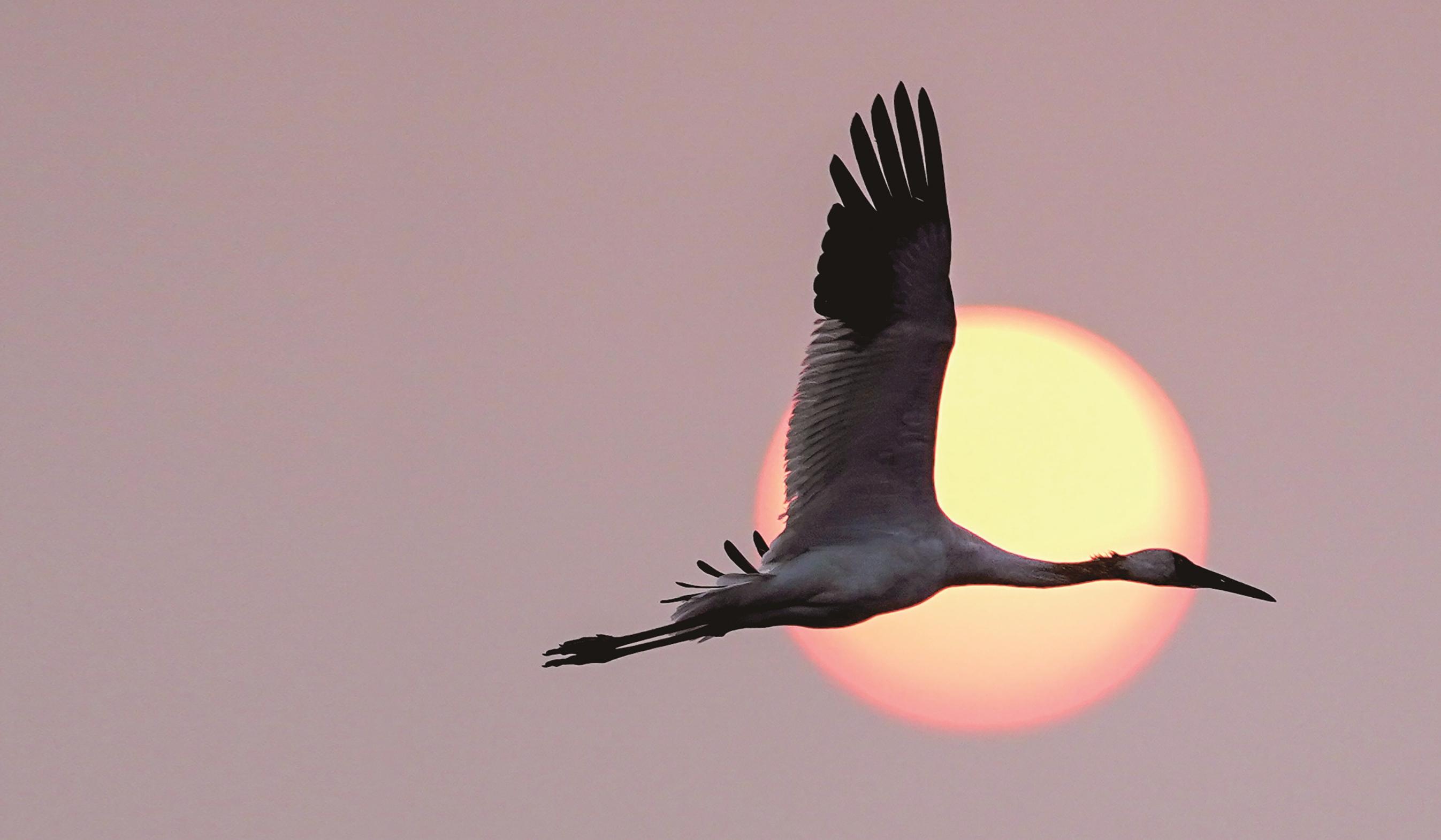 时值初冬,江西鄱阳湖区迎来大批越冬候鸟。在南昌高新区五星白鹤保护小区,成群的白鹤、天鹅等候鸟与落日余晖交错,美不胜收。