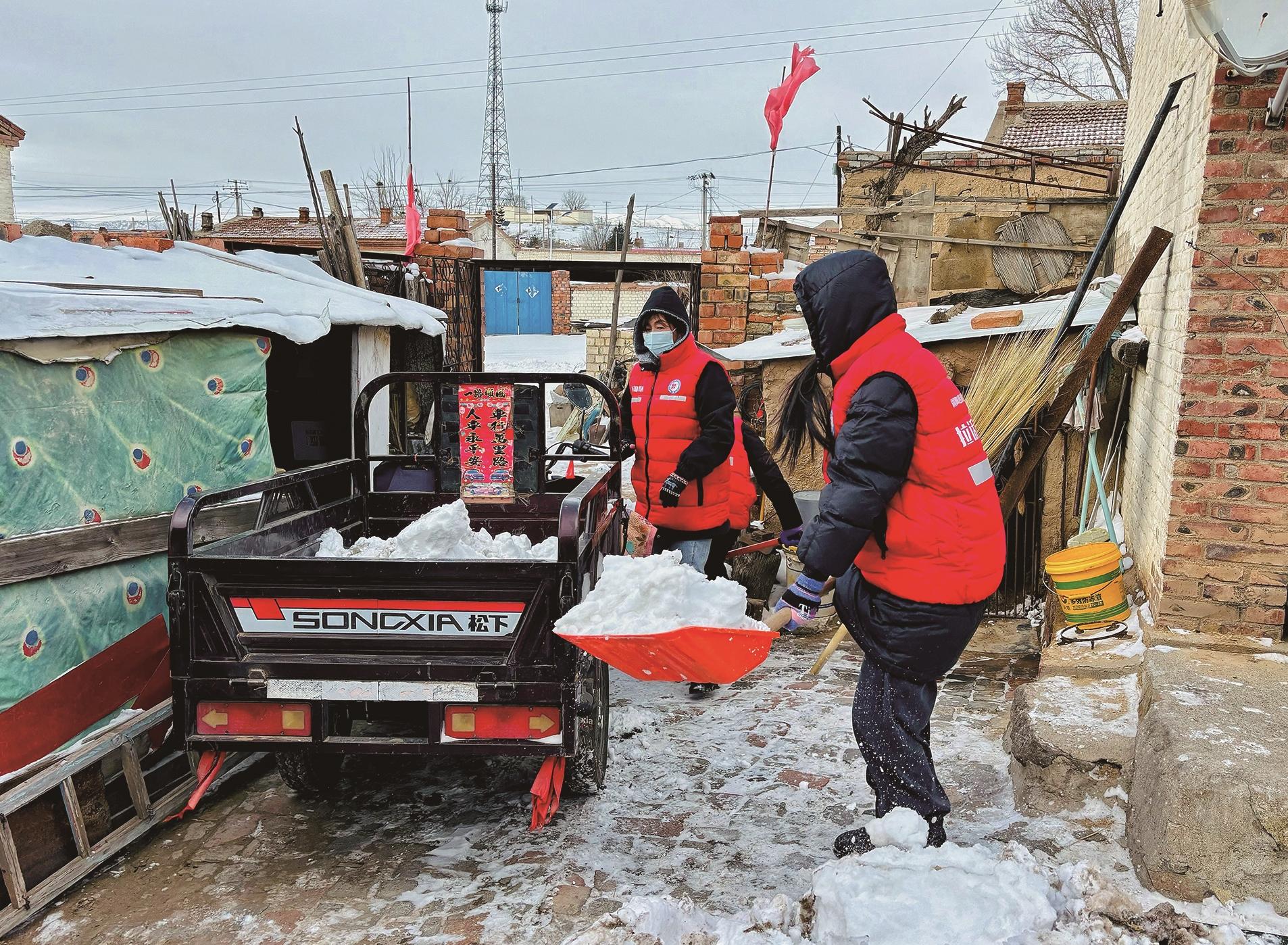 图为志愿者铲除出村道路上的积雪。