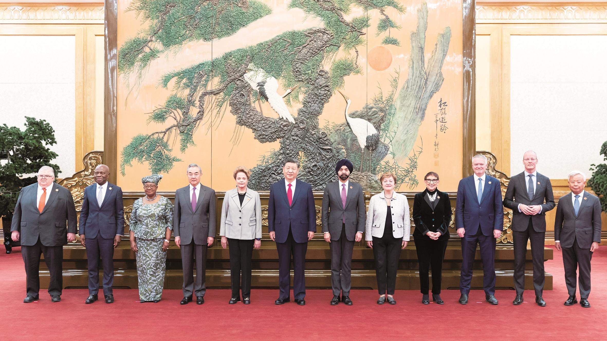 习近平同主要国际经济组织负责人合影留念,感谢他们长期支持中国现代化事业。