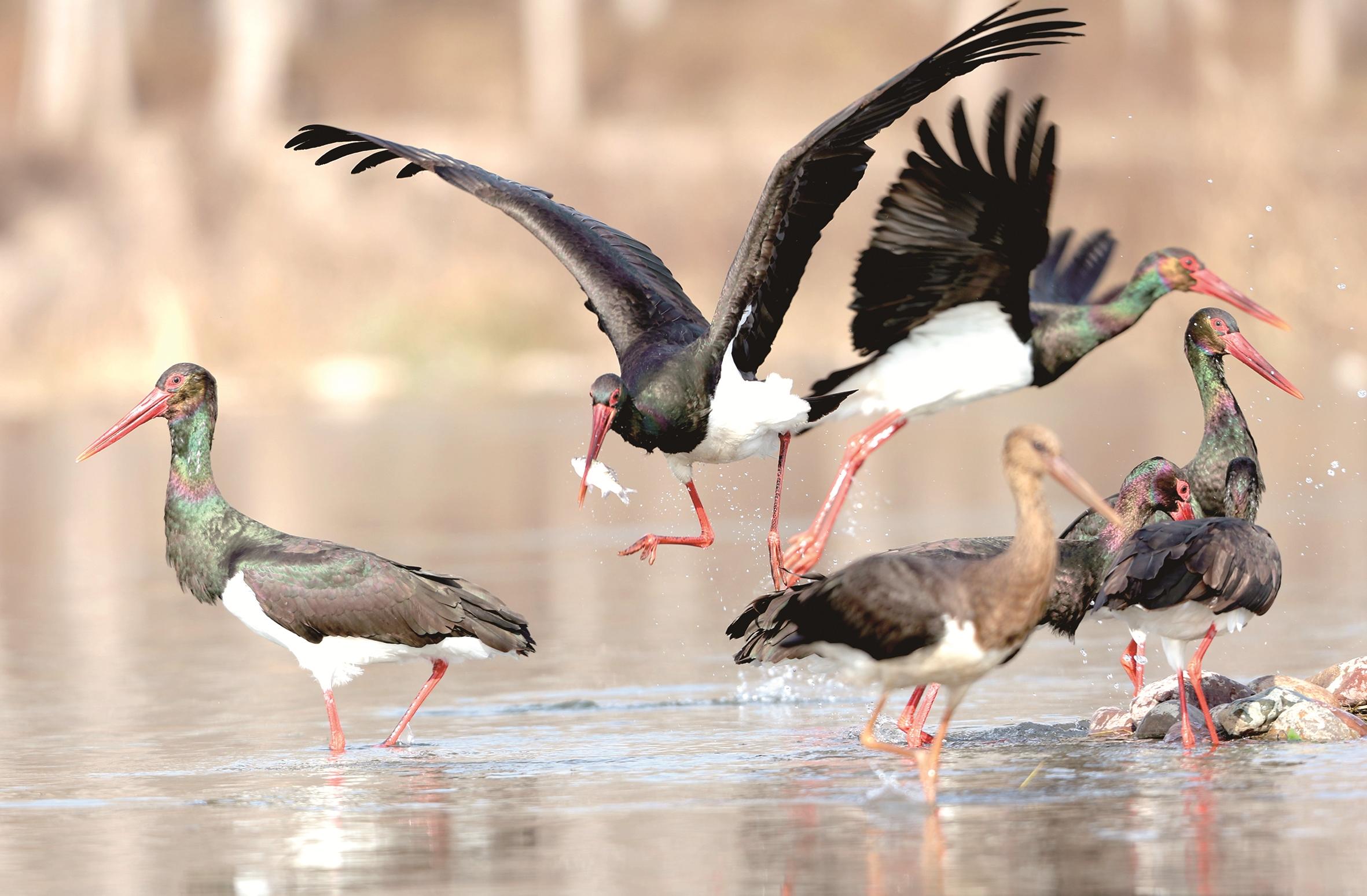 12月9日,黑鹳在河北省石家庄市平山县境内的冶河湿地嬉戏觅食。新华社发 梁子栋 摄