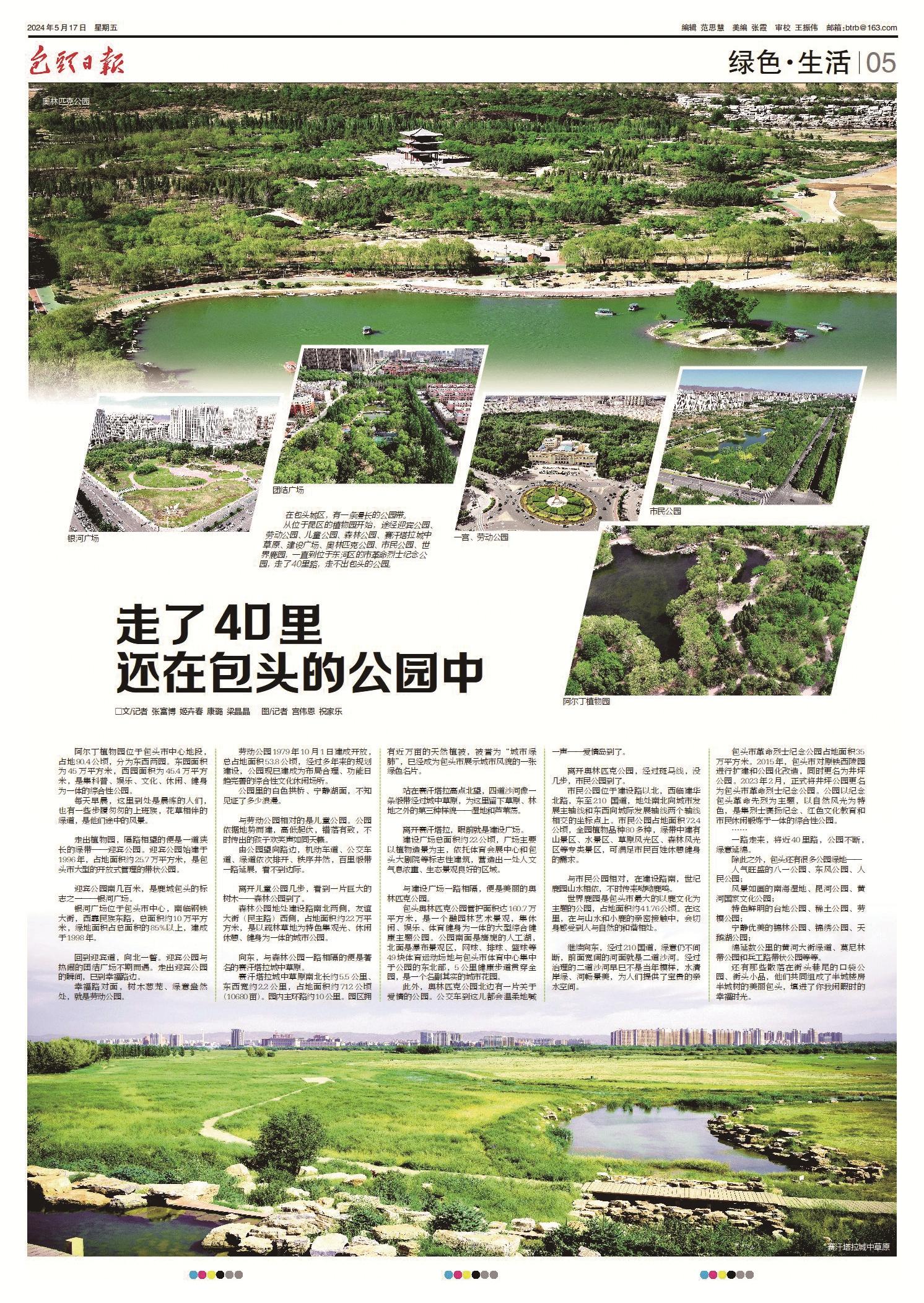 从位于昆区的植物园开始,途经迎宾公园、劳动公园、儿童公园、森林公园、赛汗塔拉城中草原、建设广场、奥林匹克公园、市民公园、世界鹿园,一直到位于东河区的市革命烈士纪念公园,走了40里路,走不出包头的公园。