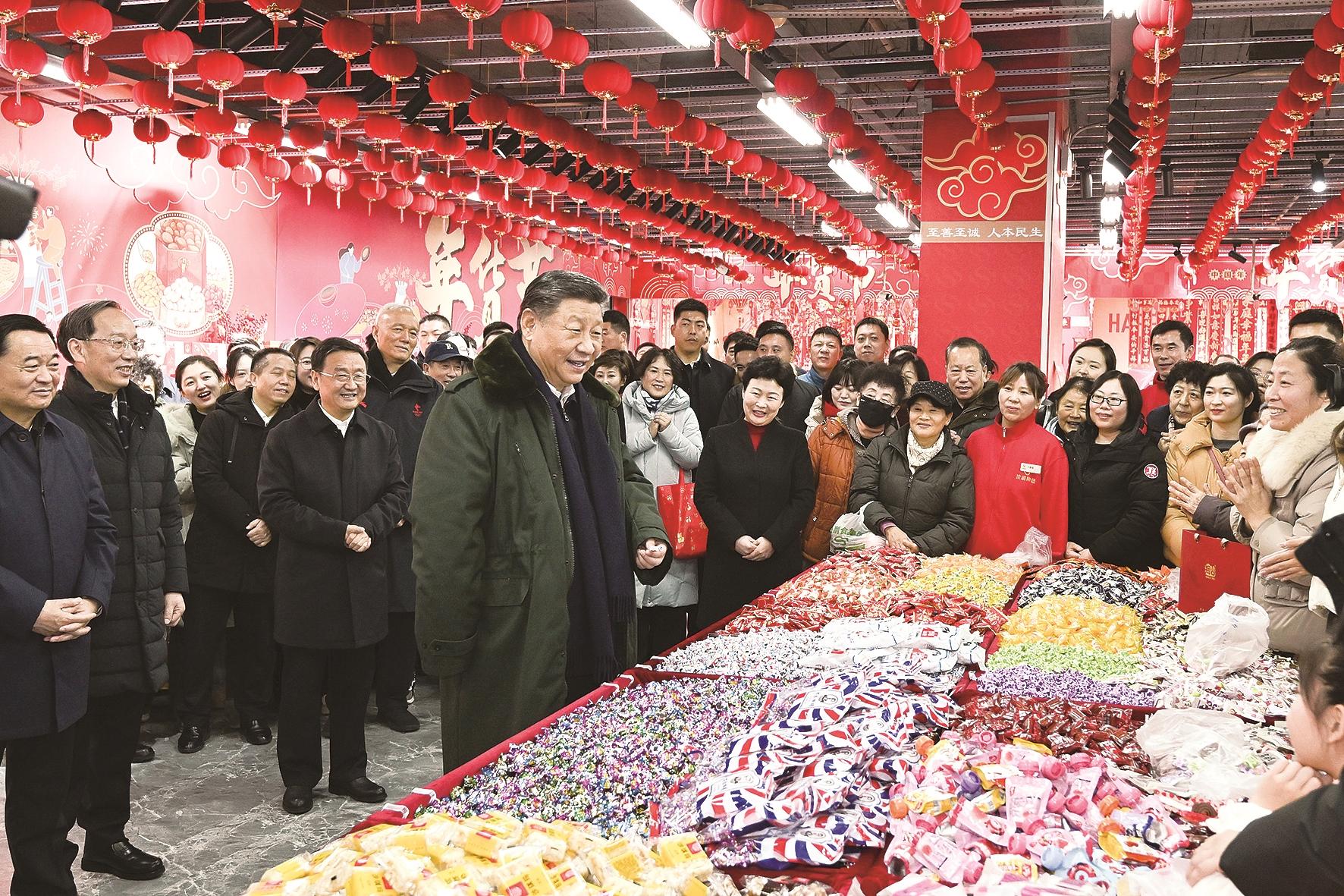 1月22日至24日,中共中央总书记、国家主席、中央军委主席习近平冒着严寒来到辽宁,看望慰问基层干部群众。这是23日上午,习近平在沈阳大东副食品商场考察时,同店主和顾客亲切交流,向大家致以新春祝福。 新华社记者 谢环驰 摄