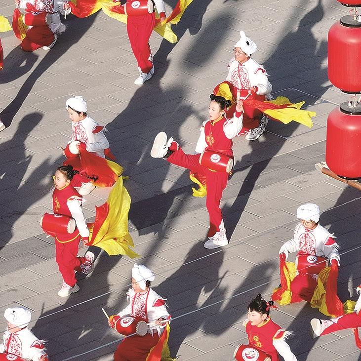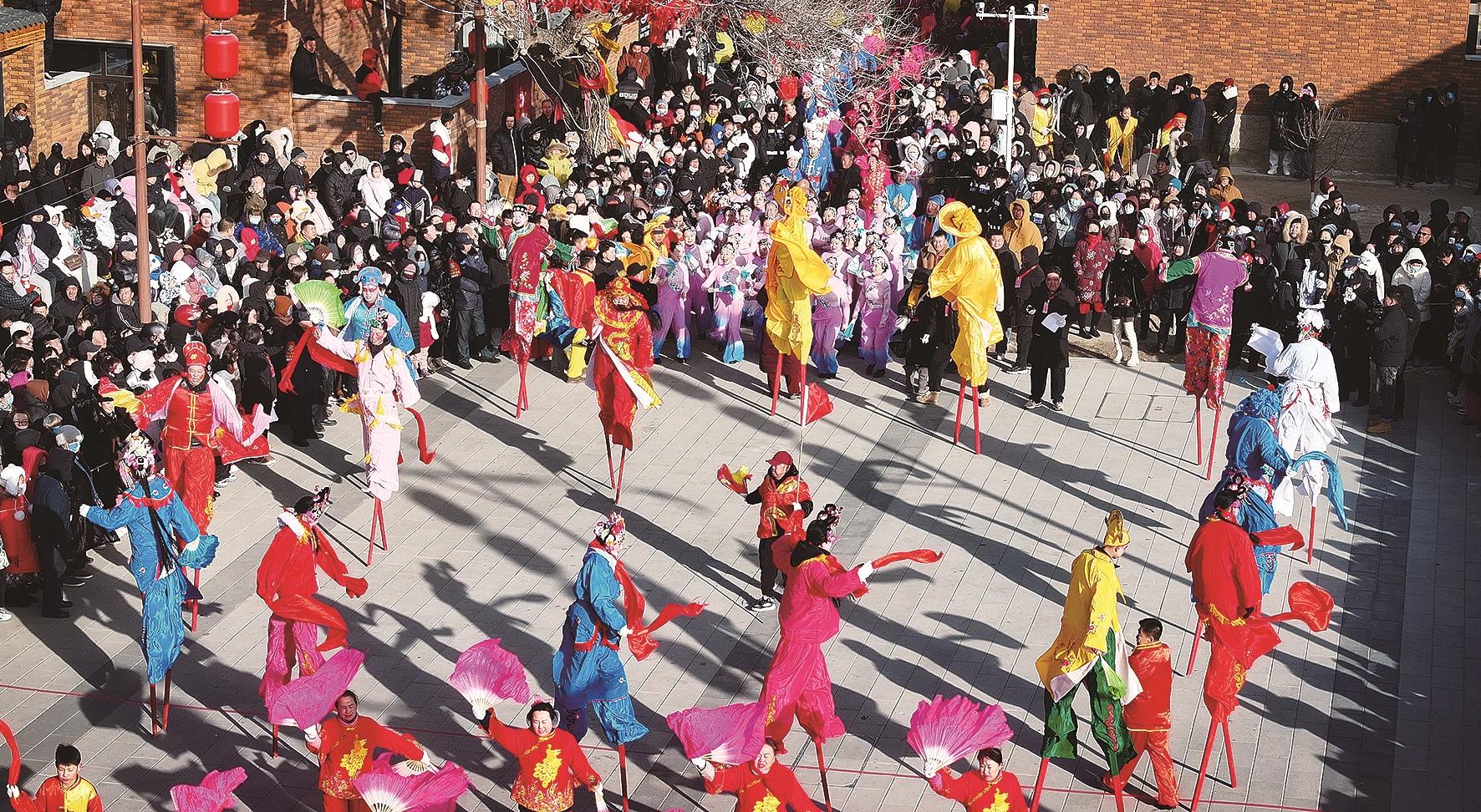 秧歌队划旱船的大爷喜气洋洋、返乡大学生秧歌代表队精气神十足、少儿腰鼓队孩童精神抖擞……活动现场热闹非凡。以孙悟空、猪八戒等历史传说故事、戏曲人物角色为扮相的高跷演员,脚绑2米多高的高跷棍,完成蹦、跳、转身等高难度动作表演,引得现场喝彩声一片,掌声不断。同时,肩扛脑阁架的成年人稳稳托举着孩童一同进行表演,成为本次社火大赛的一大亮点,吸引众多市民游客拍照留念。